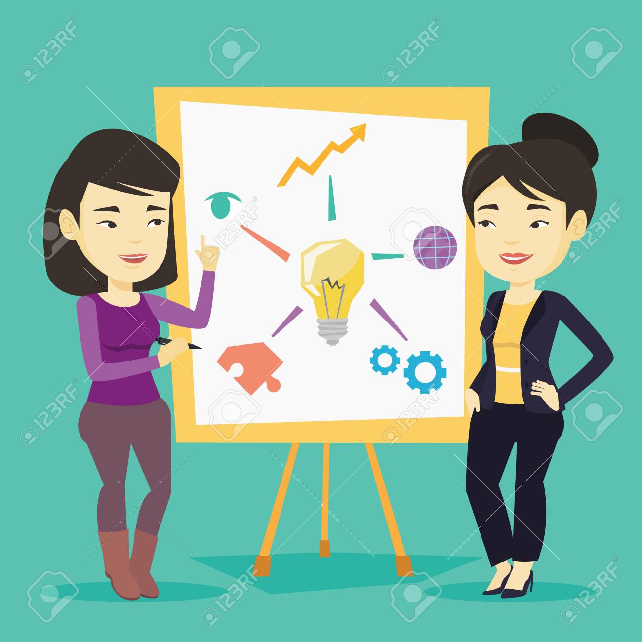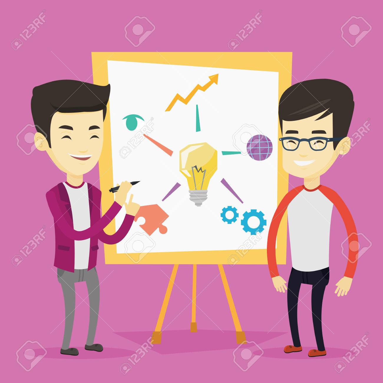 Estudiante Asiático Joven Que Explica El Proyecto Al Profesor. Grupo De Estudiantes Trabajando En Un Proyecto. Proyecto De Dibujo De Estudiante Inteligente En Pizarra. Ilustración De Diseño Plano De Vector Aislado Sobre