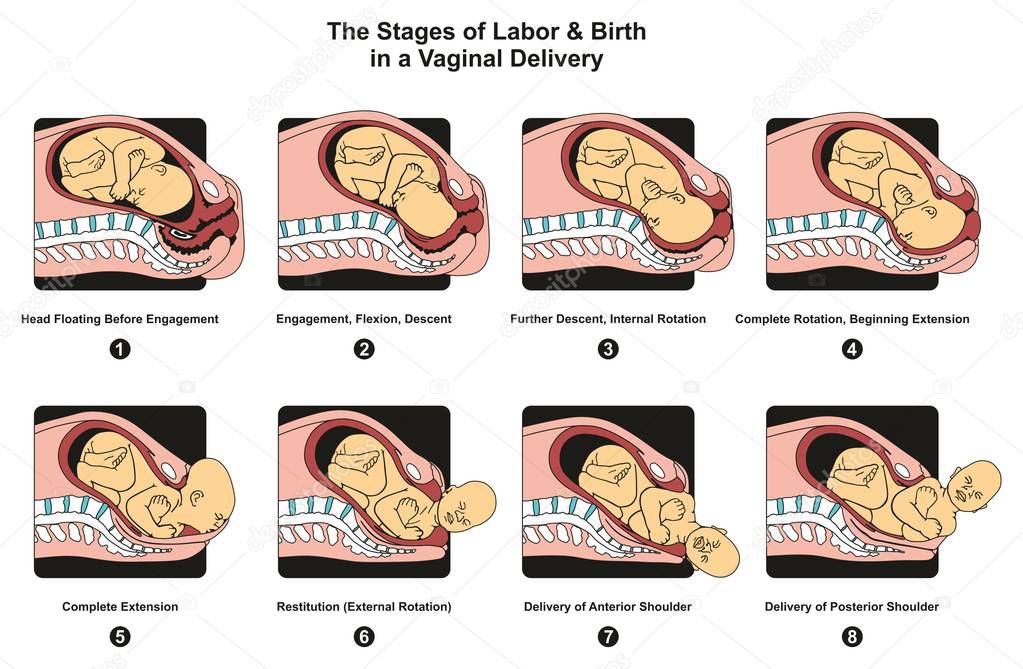 Pasos Normales De Ejecución Diagrama Infográfico Que Incluye Todas Las Etapas Del Trabajo De Parto Y El Nacimiento Del Bebé Para La Educación En Ciencias Médicas Ilustraciones svg, vectoriales, clip art vectorizado