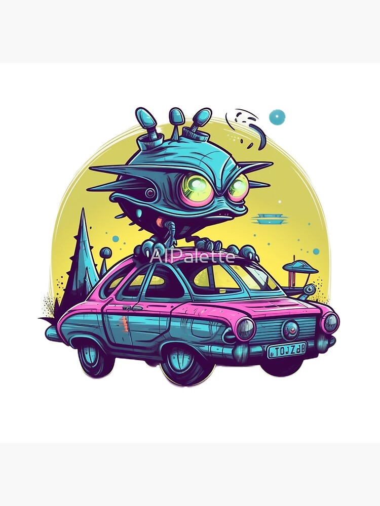 Póster for Sale con la obra «Un diseño divertido con un extraterrestre de dibujos animados que conduce un automóvil retrofuturista» de AIPalette | Redbubble