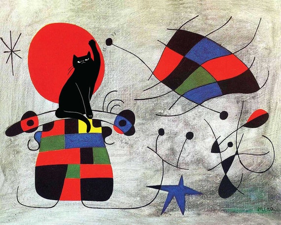 Miro con gato añadido, cuadros famosos desfigurados, gato negro, arte abstracto, arte moderno, la sonrisa de las alas extravagantes, póster - Etsy España