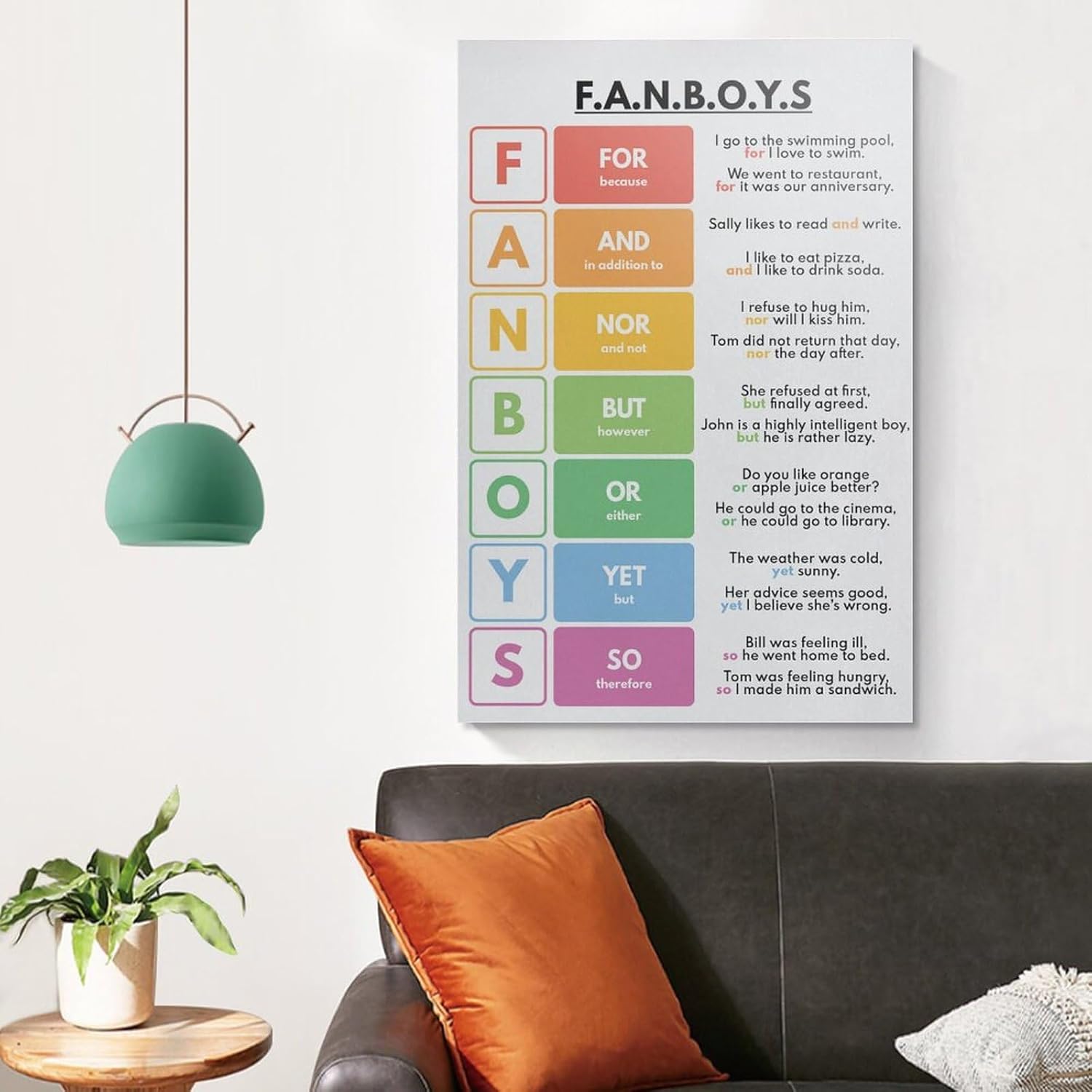 Amazon.com: BLUDUG Fanboys - Póster de conjunciones, partes del discurso, gramática inglesa, idioma, decoración de aula, pintura en lienzo educativo, póster de arte de pared para dormitorio, sala de estar, 12 x :