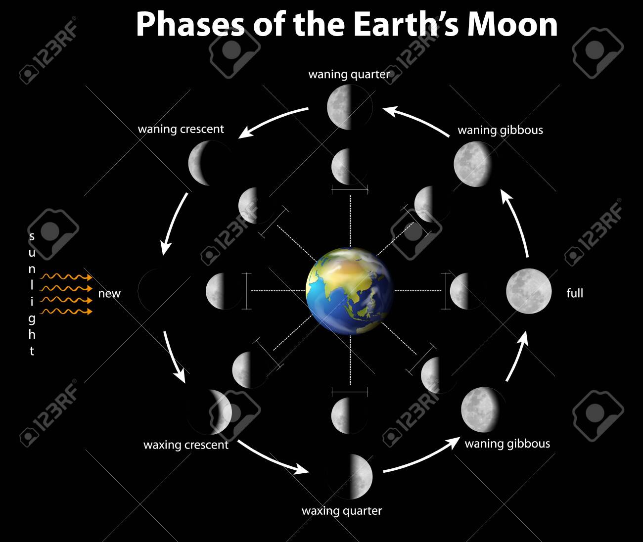 Diagrama Que Muestra Las Fases De La Luna En La Ilustración De La Tierra Ilustraciones svg, vectoriales, clip art vectorizado libre de derechos. Image 139465731
