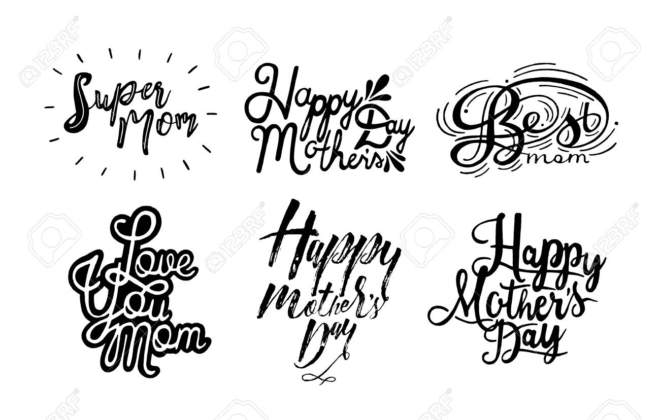 Conjunto De Inscripción Feliz Día De La Madre, Te Amo Mamá, Super, Mejor Mamá. Letras Dibujadas A Mano Blanco Y Negro Sobre Fondo Blanco. Ilustraciones svg, vectoriales, clip art vectorizado libre de