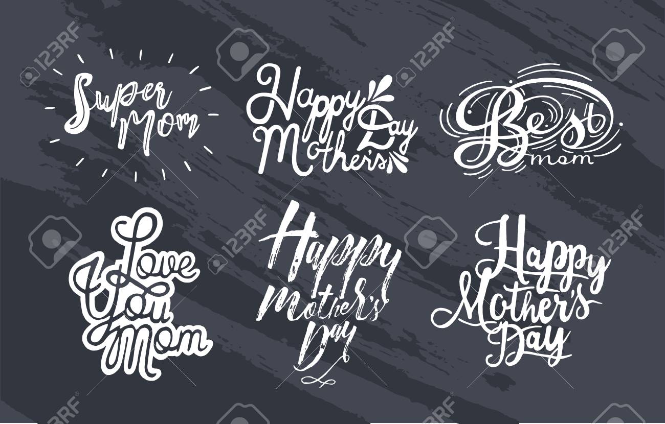 Conjunto De Inscripción Feliz Día De La Madre, Te Quiero Mamá, Super, Mejor Mamá Letras Dibujadas Mano Blanco Y Negro Sobre Fondo Negro. Ilustraciones svg, vectoriales, clip art vectorizado libre de derechos.