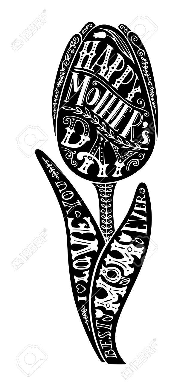 Feliz Día De La Madre! La Mejor Mamá De Todas. ¡Te Amo! Vector De La Tarjeta Tipográfico Blanco Y Negro Con La Flor Del Tulipán De La Primavera. Letras Elemento De Diseño