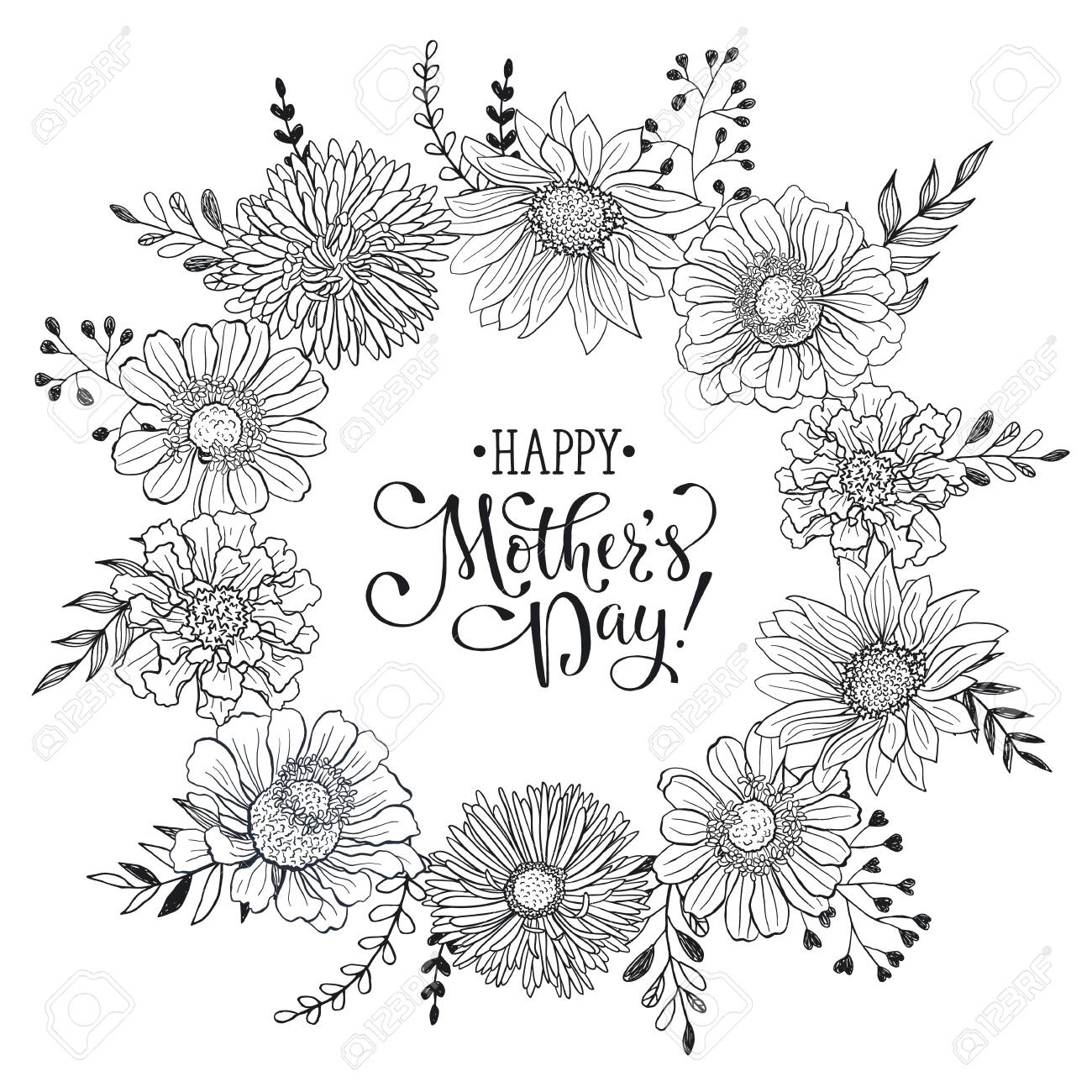 Plantilla De La Tarjeta De Felicitación Del Día De La Madre. Feliz Día De La Madre Redacción Con Flores Dibujado A Mano Negro Sobre Fondo Blanco. Fotograma De Bosquejo Decorativo De Las