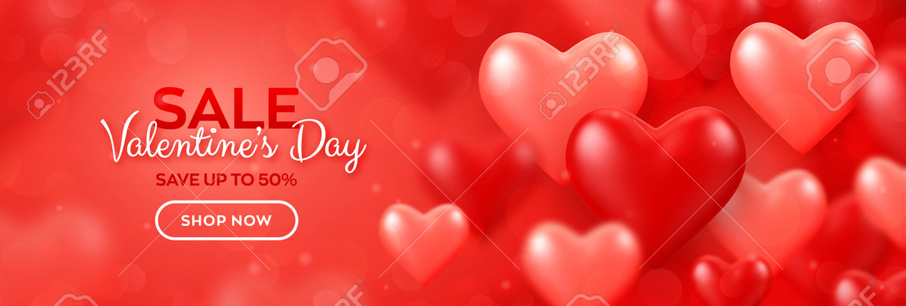 Feliz Día De San Valentín. Banner De Venta Del Día De San Valentín Con Fondo De Corazones 3d De Globos Rojos Y Rosas. Fondo De Pantalla, Volante, Invitación, Afiche, Folleto, Tarjeta De