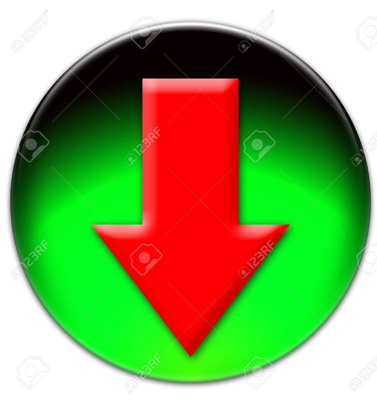 Flecha Roja Mirando Hacia Abajo En Un Botón Verde Vidriosos Aislados Sobre Fondo Blanco Fotos, retratos, imágenes y fotografía de archivo libres de derecho. Image 19653899