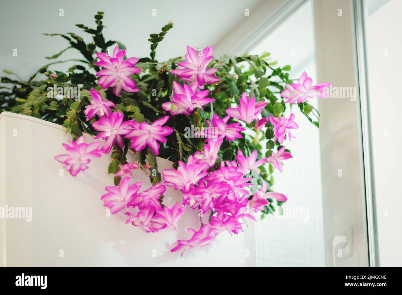 Una flor de cactus en macetas con flores rosas en un interior doméstico Fotografía de stock - Alamy