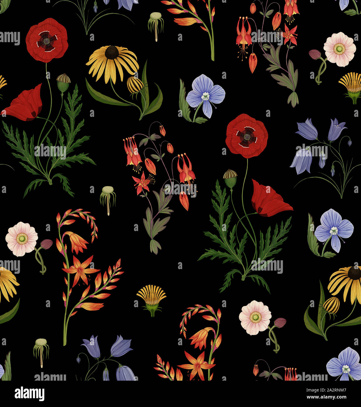Patrón De Flores Y Hojas De Colores Ilustración Vectorial Fondo Oscuro Perfecto Para Imprimir En Tela O Papel Patrón De Flores De Colores Naturales Ilustraciones svg, vectoriales, clip art vectorizado libre de