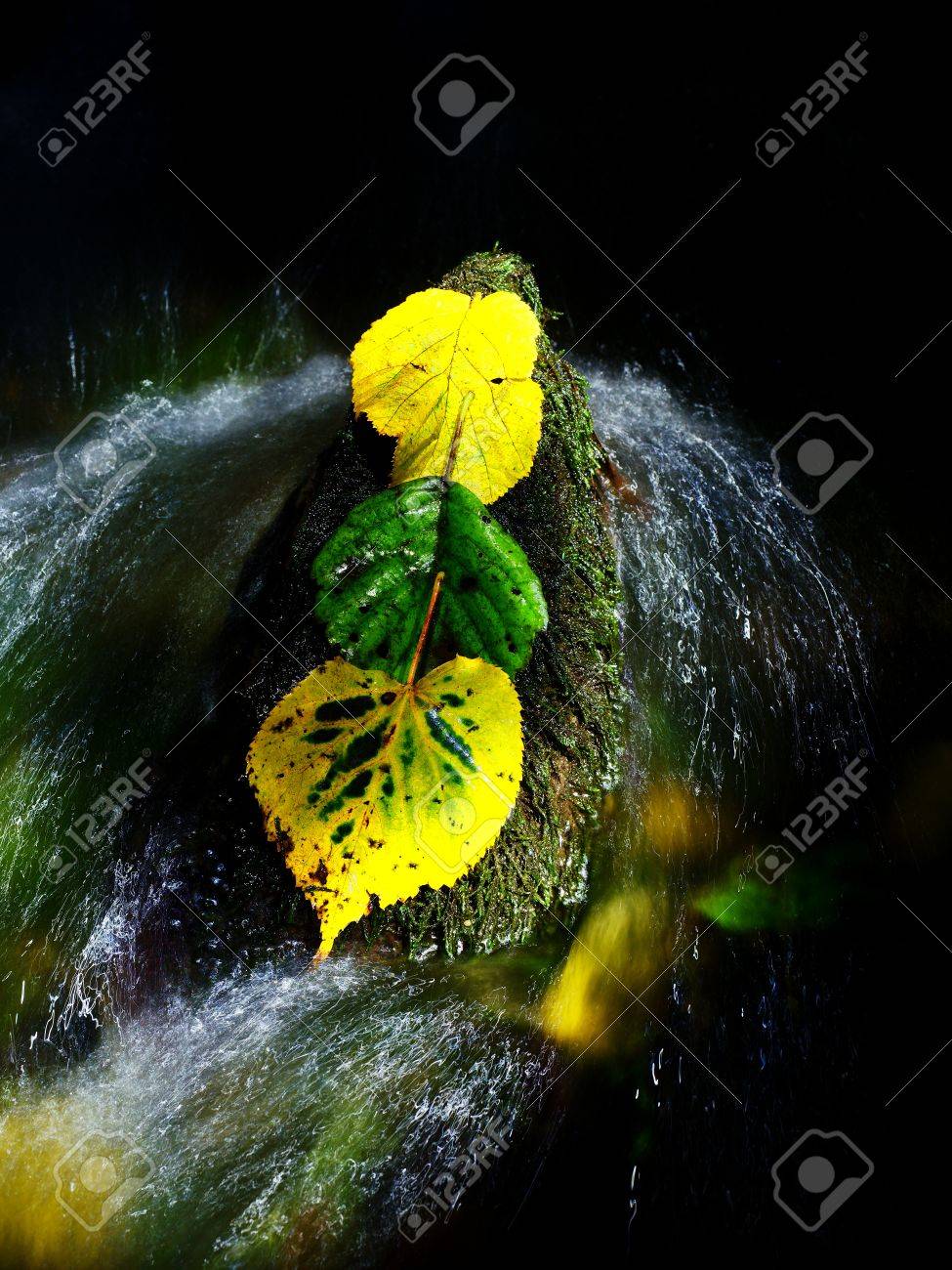 Aliso Verde Amarillo Se Va En Rápido Flujo. Detalle De Tresillos De La Hoja De Aliso Podrido Yacía Sobre Piedra Oscura En El Agua Brillante De Los Rápidos. Hojas Otoñales Fotos, retratos,