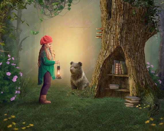 Bosque encantado fondo digital / fondo digital. Oso bebé en lugar secreto con libros en el árbol. - Etsy España