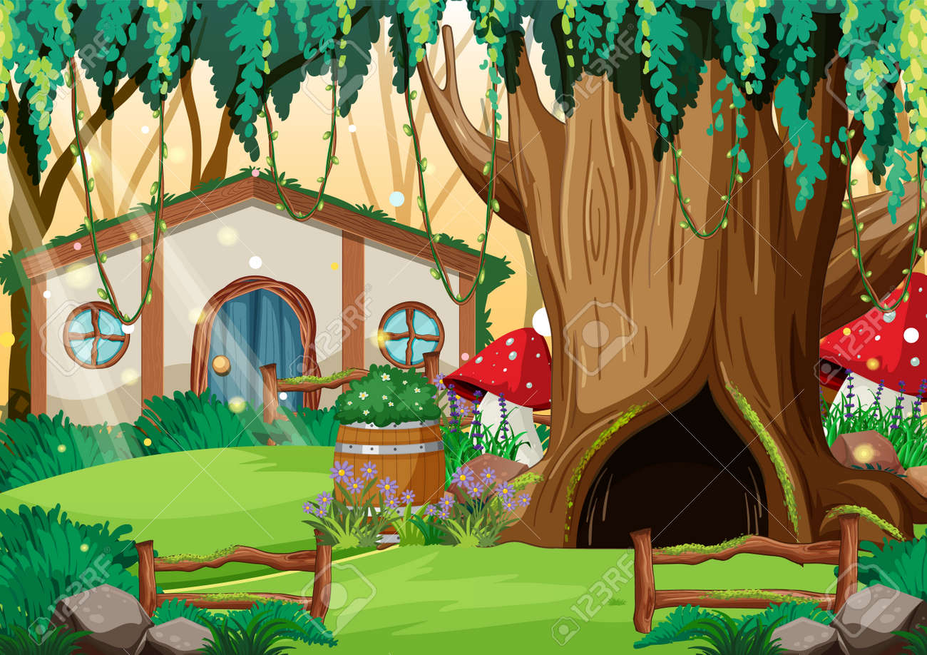 Fondo De Bosque Encantado Con Casa De árbol Ilustración del Vector - Ilustración de ramificaciones, casero: 230160222