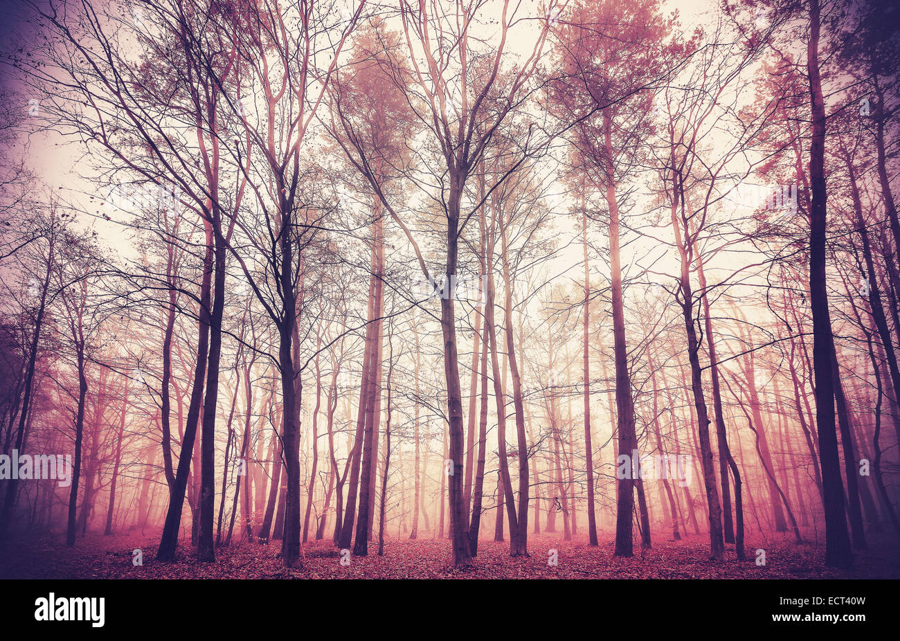 Bosque Extraño En Una Niebla Bosque Misterioso De Hadas Atmósfera Mística Paranormal Otro Mundo Parque Oscuro Y Aterrador Con Hojas Rosadas Fondo Para Fondo De Pantalla Horrible Sueño Foto de stock y