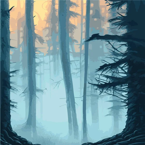 Imprimir Bosque Misterioso. Paisaje De Fondo En El Bosque De Niebla Crepuscular De La Noche. Ilustración En Color De Dibujos Animados De Taiga Oscuro Ilustraciones svg, vectoriales, clip art vectorizado libre de