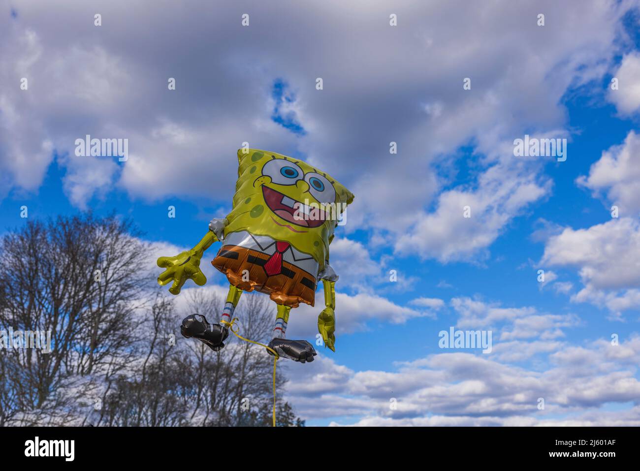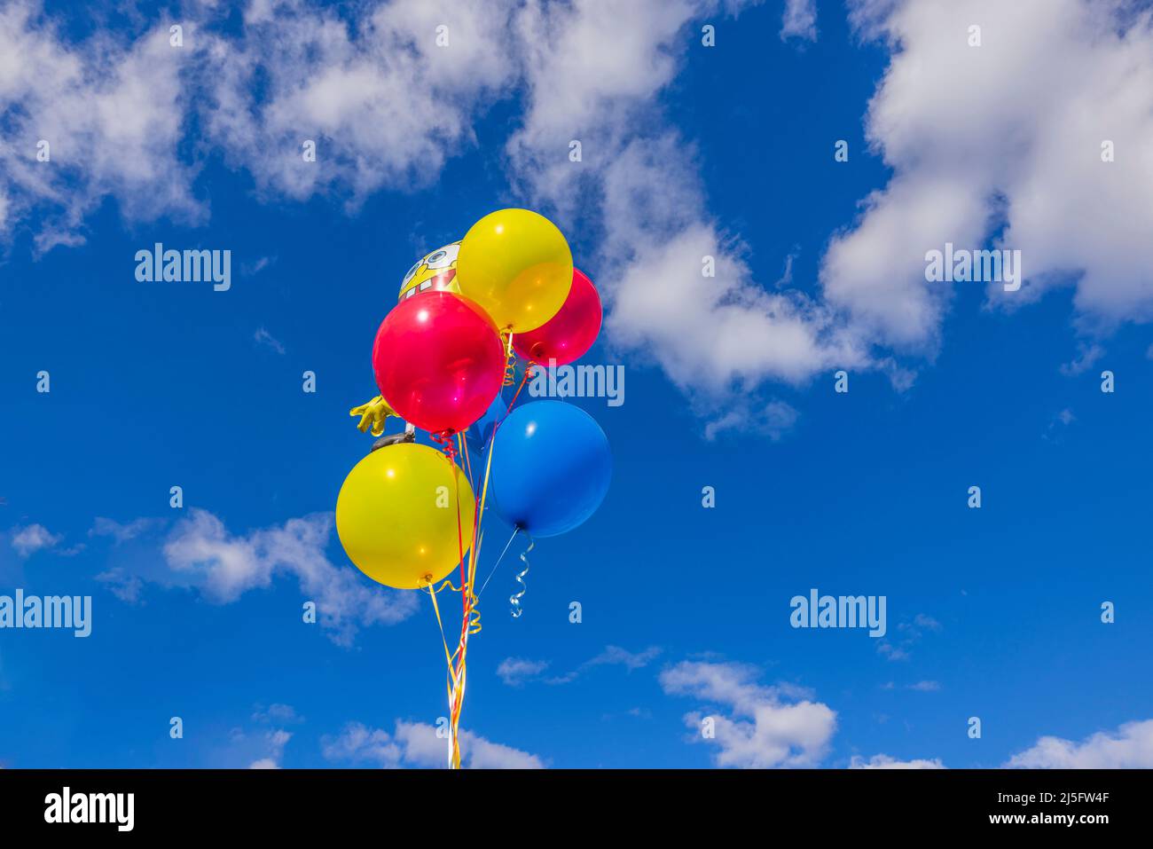 Hermosa vista de globos de helio colorido y figura de Bob esponja sobre fondo de cielo azul. SUECIA Fotografía de stock - Alamy