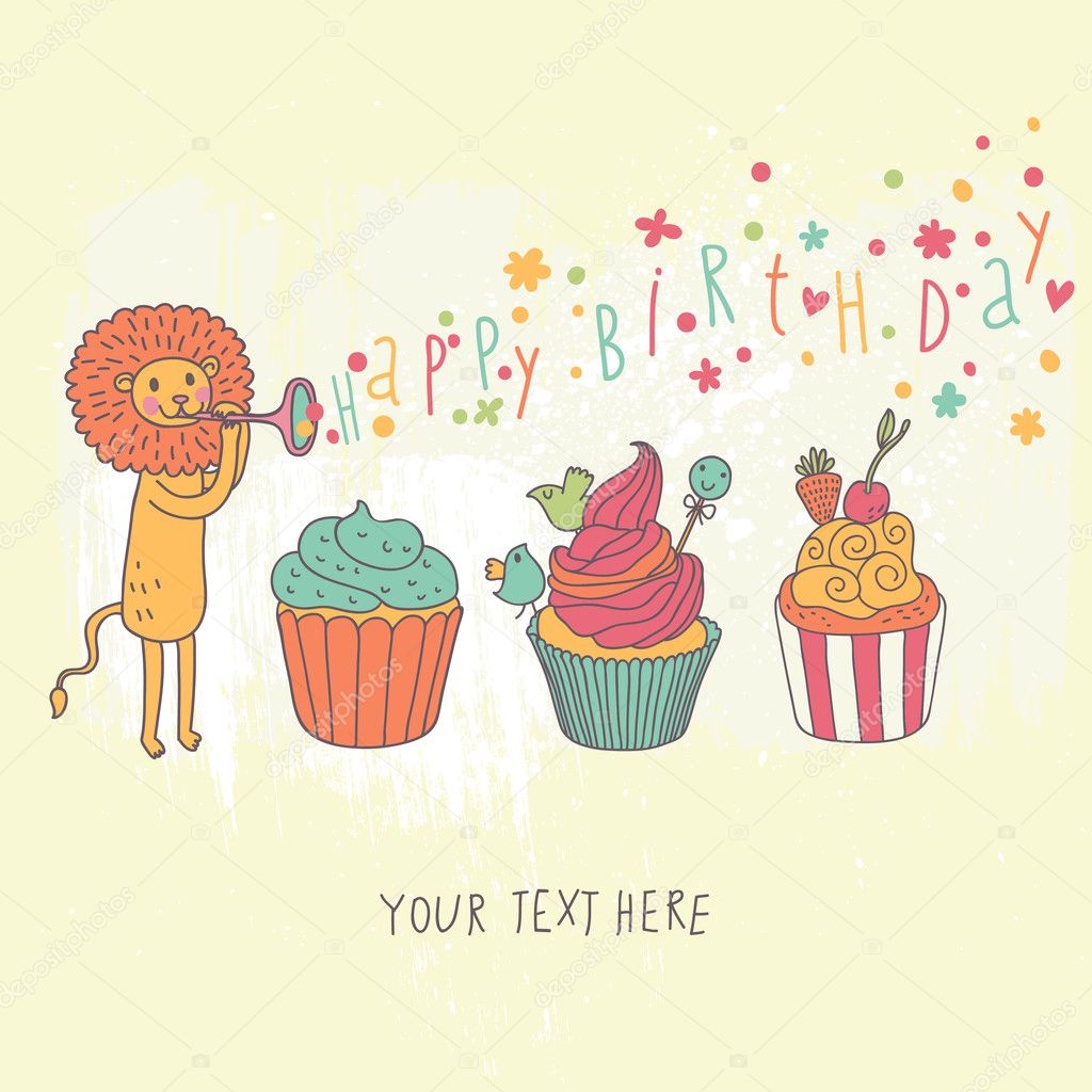 Tarjeta De Feliz Cumpleaños Con Cupcakes De Dibujos Animados ...