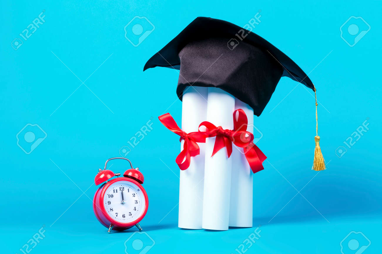 Gorro De Graduación En Diplomas Cerca Del Reloj Rojo, Imagen Sobre Un Fondo Azul, Concepto De Tiempo De Graduación Fotos, retratos, imágenes y fotografía de archivo libres de derecho. Image 121575512