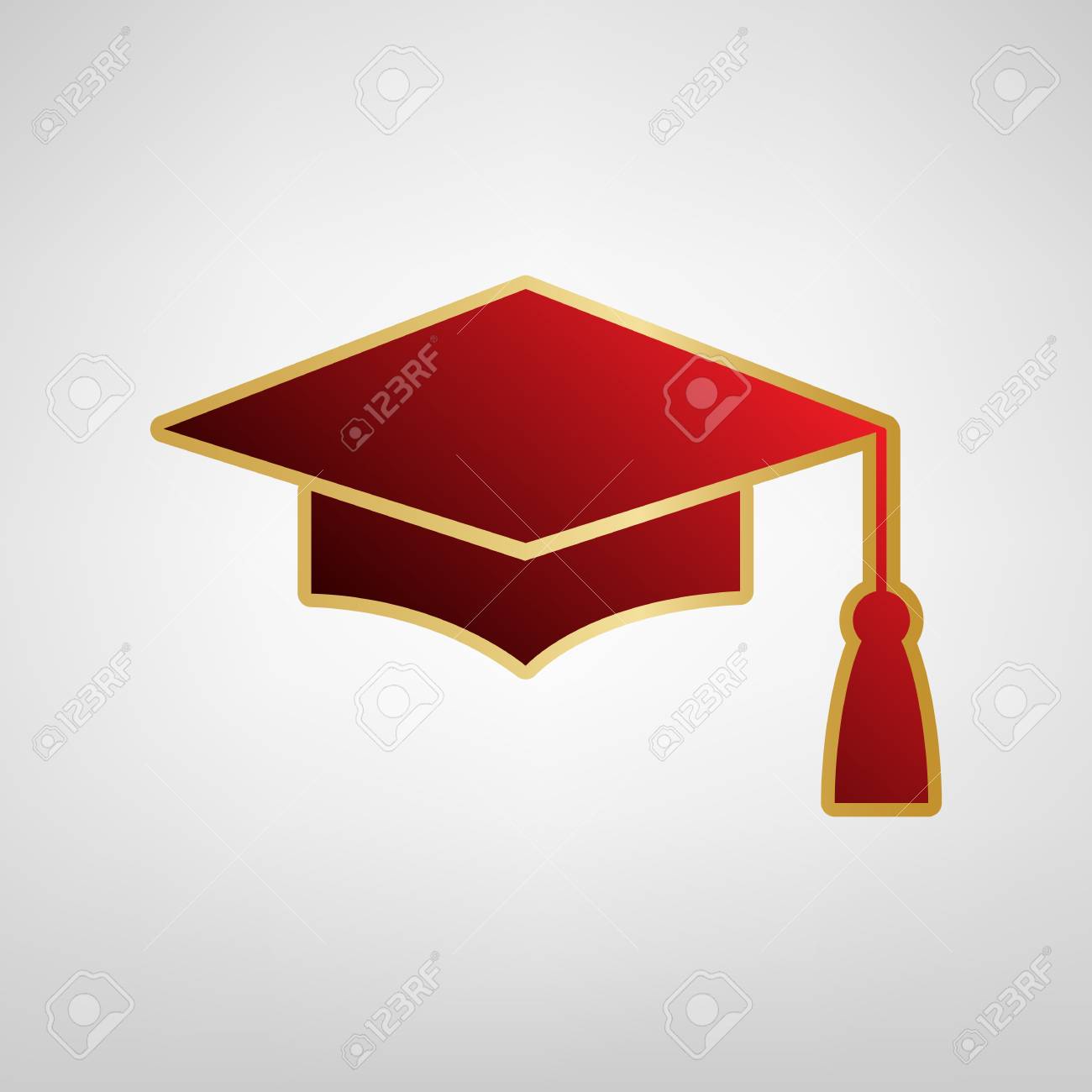 Junta De Mortero O Gorra De Graduación, Símbolo De La Educación. Vector. Icono Rojo En Etiqueta De Oro En El Fondo Gris Claro. Ilustraciones svg, vectoriales, clip art vectorizado libre de derechos.