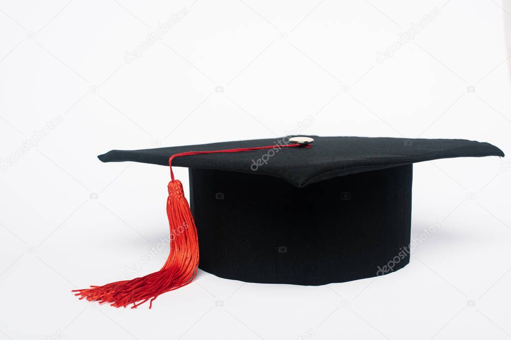Gorra de graduación de sombrero de mortero realista vectorial de un estudiante con un sombrero negro de borla roja en la graduación en | Vector Premium