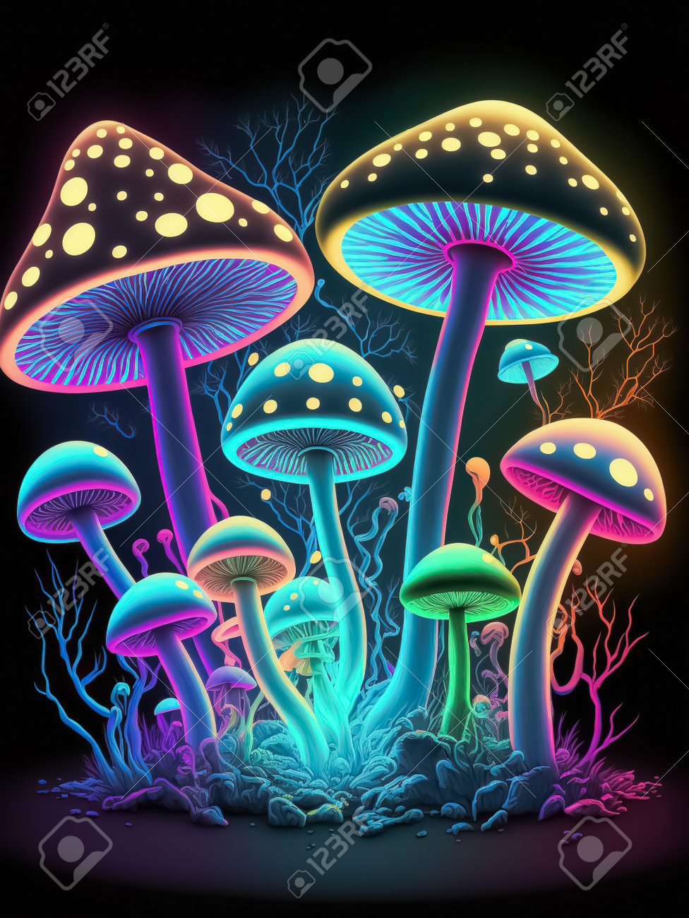 Ilustración De Fantasía De Hongos Mágicos Brillantes De Color Neón. Fondo Luminoso Trippy Psicodélico. Concepto Chamánico Y Espiritual. Ai Generativa Fotos, retratos, imágenes y fotografía de archivo libres de derecho. Image 202594482