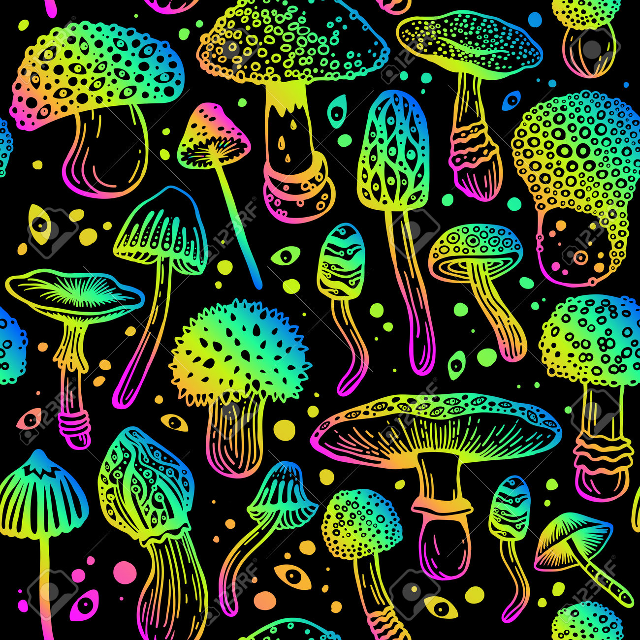 Fondo De Hongos Psicodélicos. Hongos Trippy Mágicos. Ilustraciones svg, vectoriales, clip art vectorizado libre de derechos. Image 184199671