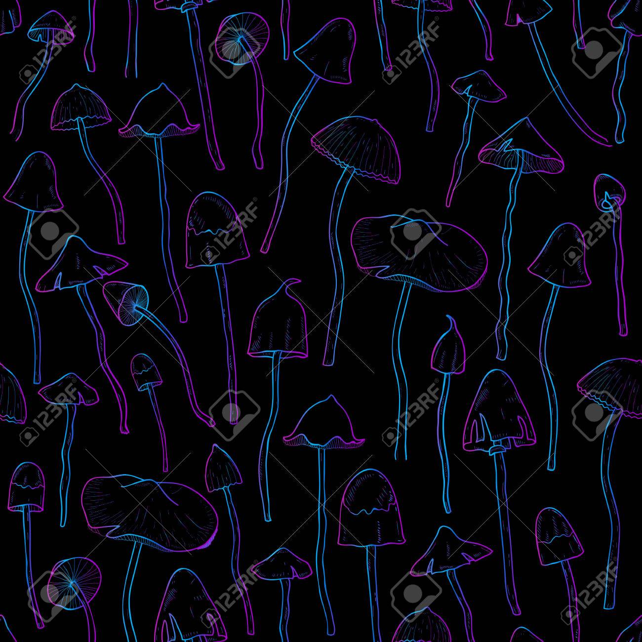 Psychedelic seta sin costuras pattern.bright pink violete gradiente contorno, fondo de púrpura oscuro. Hongos alucinógenos de fantasía, cada hongo h Imagen Vector de stock - Alamy