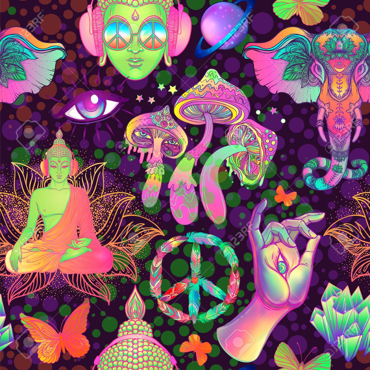 Patrón Psicodélico Sin Costuras: Hongos Trippy, Signo De La Paz, Buda Ácido, Mariposas, Ojo Que Todo Lo Ve, Mandala. Fondo Con Elementos De Drogas Trippy Apedreados En Estilo Cómic De Dibujos Animados.