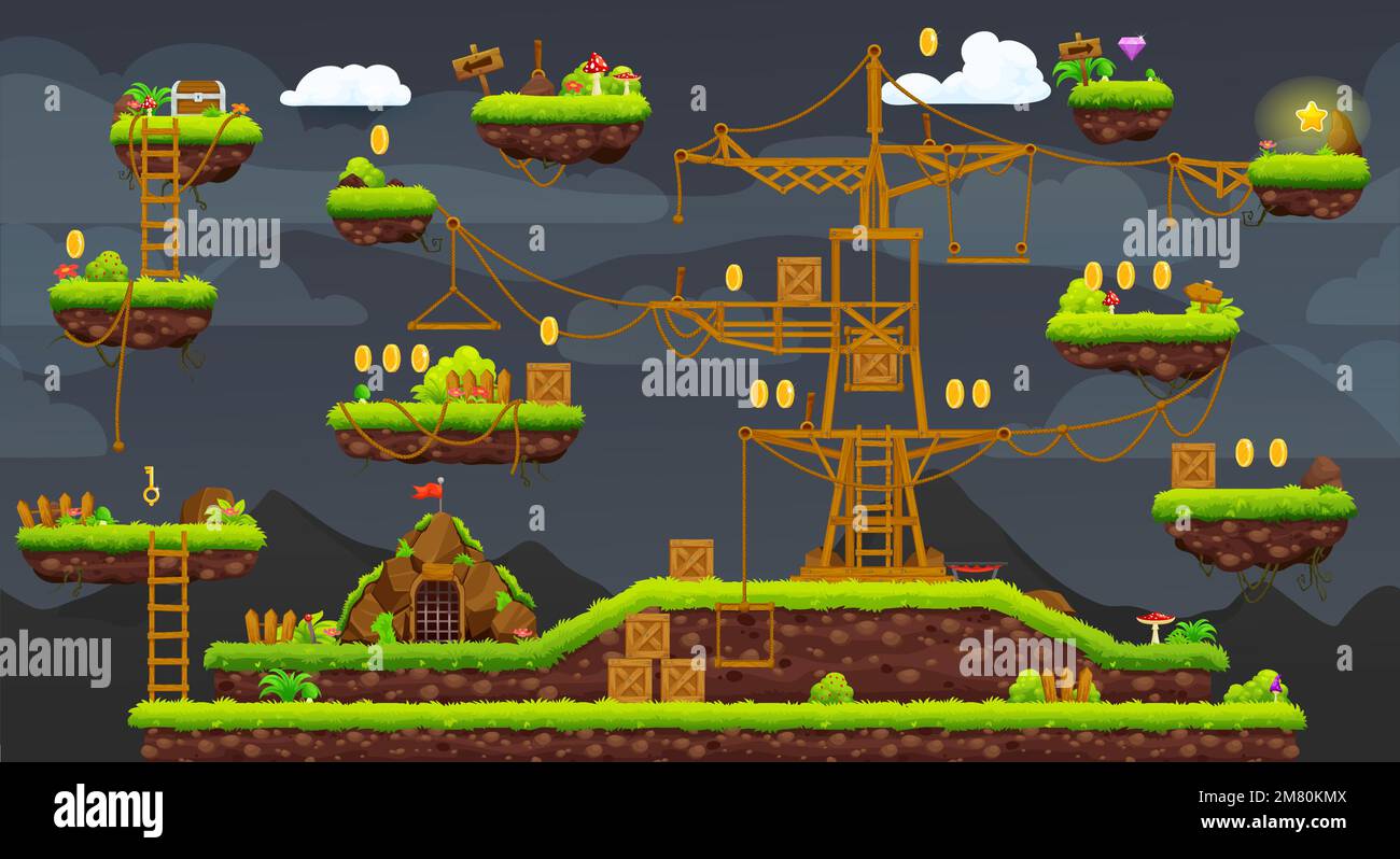 2d arcade juego de noche nivel de interfaz de mapa. Plataforma, escaleras, monedas, bonos e iconos del tesoro. Vector paisaje con islas flotantes con hierba, cuerdas y escaleras. Fondo de videojuego, mundo