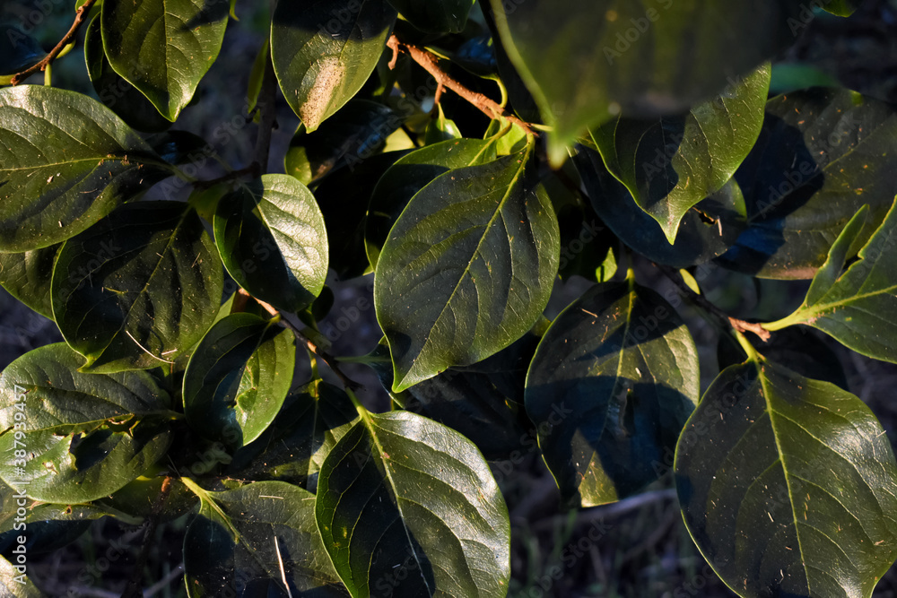 Fondo natural de grandes hojas verdes del árbol del caqui bajo la luz del sol del atardecer, cubiertas con restos de maleza seca que necesita limpieza para evitar plagas. Stock Photo |