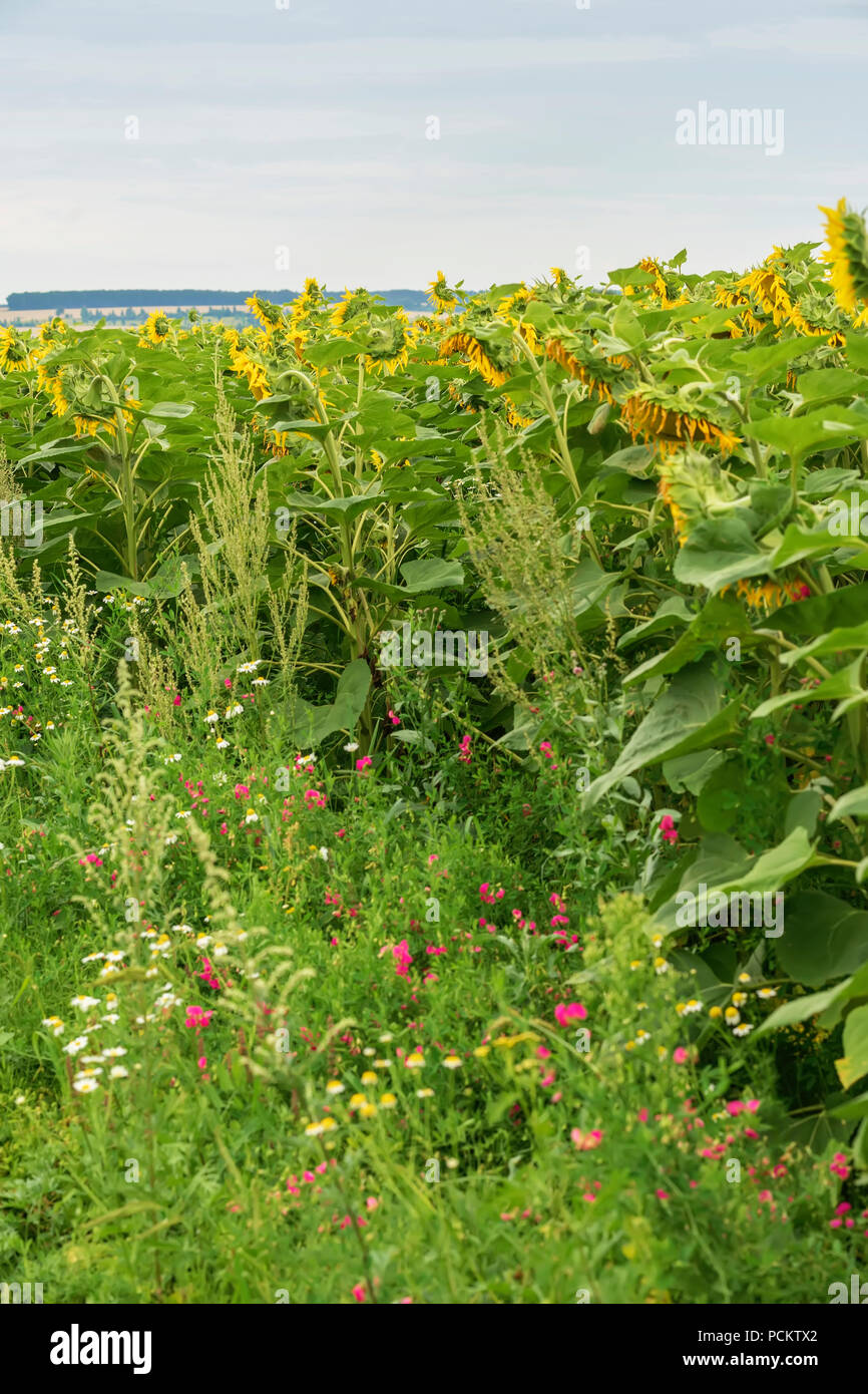 La agricultura. Campo de girasoles flores silvestres y malezas brillante . De agosto, por la tarde después de la lluvia. Fondo de verano natural vertical Fotografía de stock - Alamy