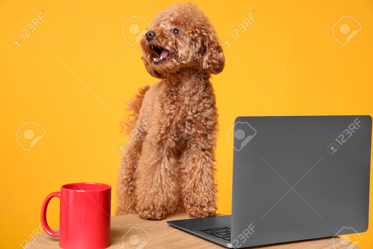 Lindo Perro Maltipoo En El Escritorio Con Una Computadora Portátil Y Una Taza Roja Sobre Fondo Naranja Fotos, retratos, imágenes y fotografía de archivo libres de derecho. Image 216256335