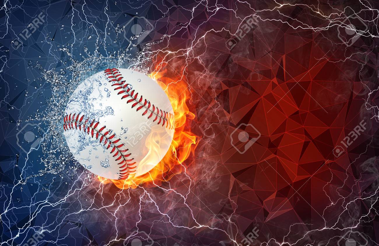 Pelota De Softbol En El Fuego Y El Agua Con Iluminación Alrededor En Fondo Abstracto Poligonal. Diseño Horizontal Con Espacio De Texto. Fotos, retratos, imágenes y fotografía de archivo libres de derecho.