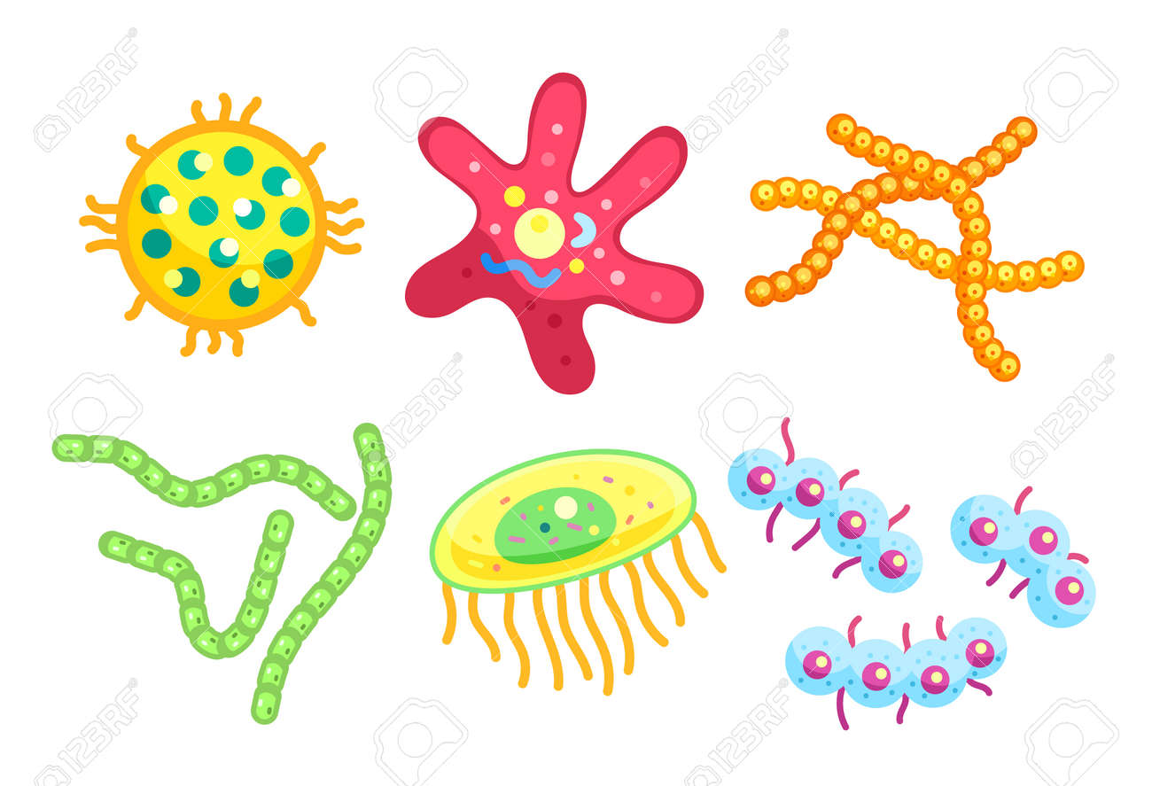 Estreptococos Y Estafilococos, Espirillas Y Tipos De Bacterias Planas En Forma De Estrella Aisladas. Pequeñas Ilustraciones De Vectores De Dibujos Animados De Variedad De Germen Peligroso Ilustraciones svg, vectoriales, clip art vectorizado