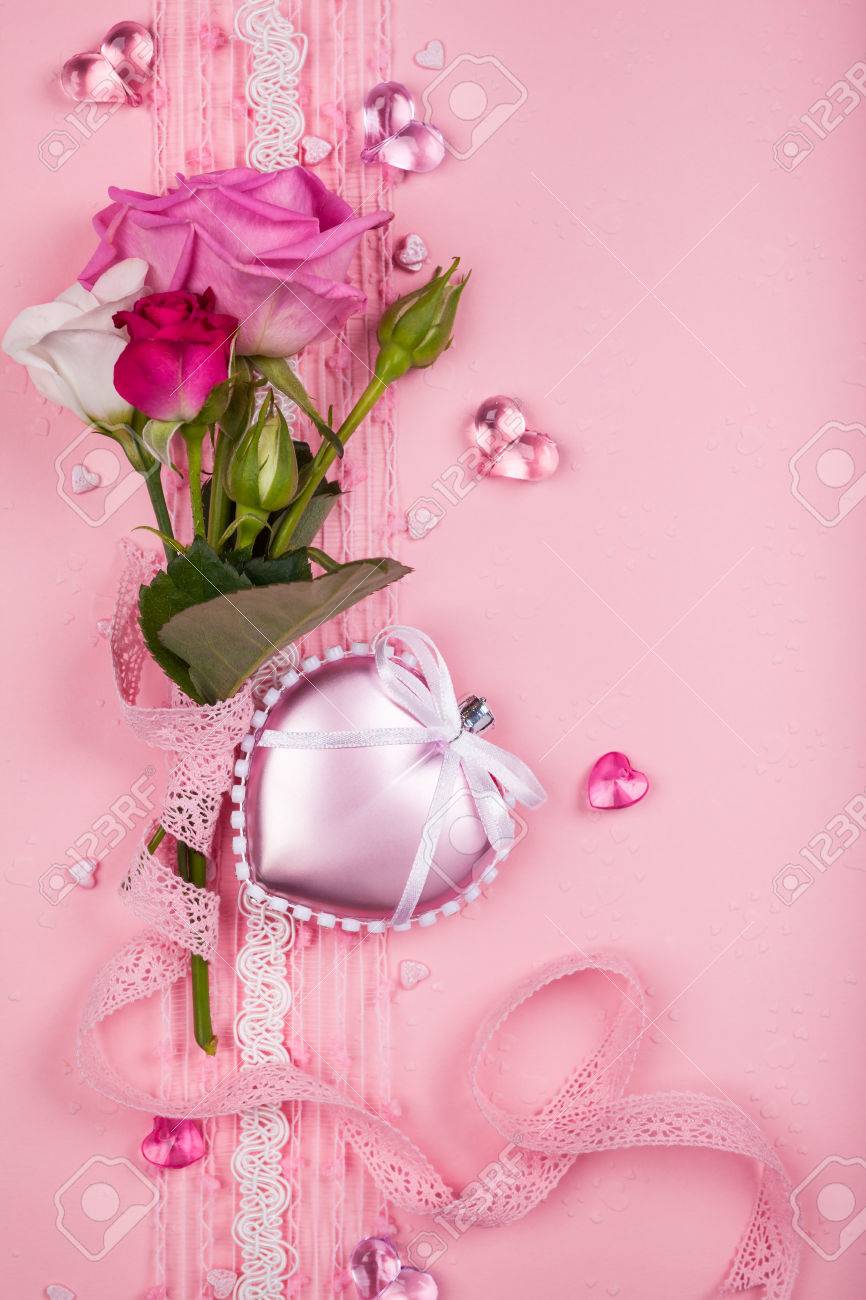 Tarjeta Del Día De San Valentín Con Flores Y Corazones Sobre Fondo De Color Rosa Fotos, retratos, imágenes y fotografía de archivo libres de derecho. Image 33438430