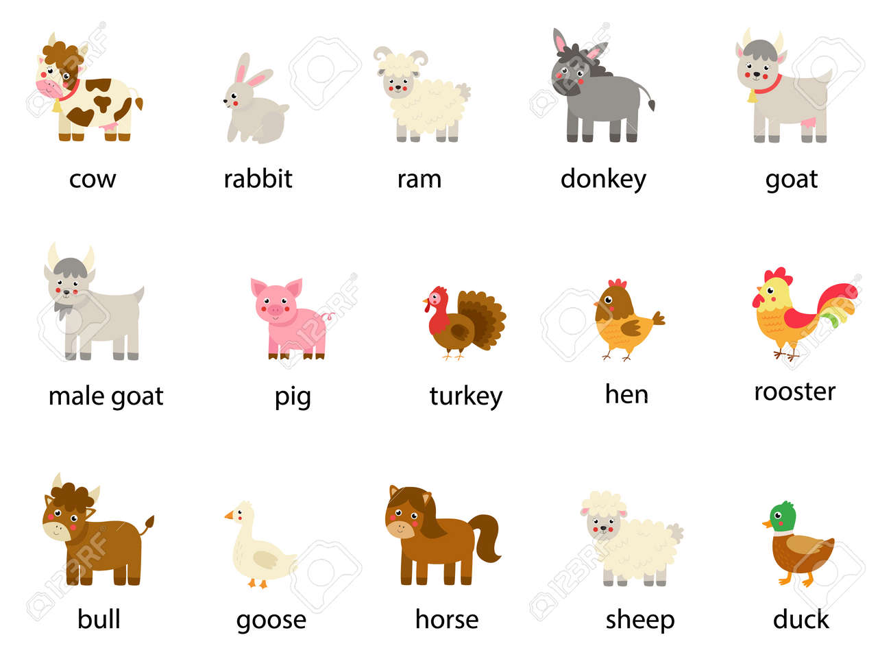 Conjunto De Animales De Granja Con Nombre En Inglés. Colección De Ilustraciones Vectoriales. Ilustraciones svg, vectoriales, clip art vectorizado libre de derechos. Image 169813282