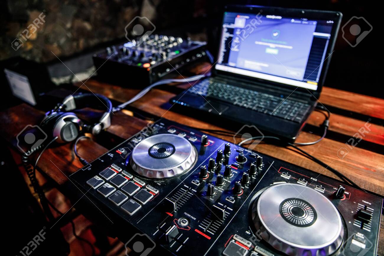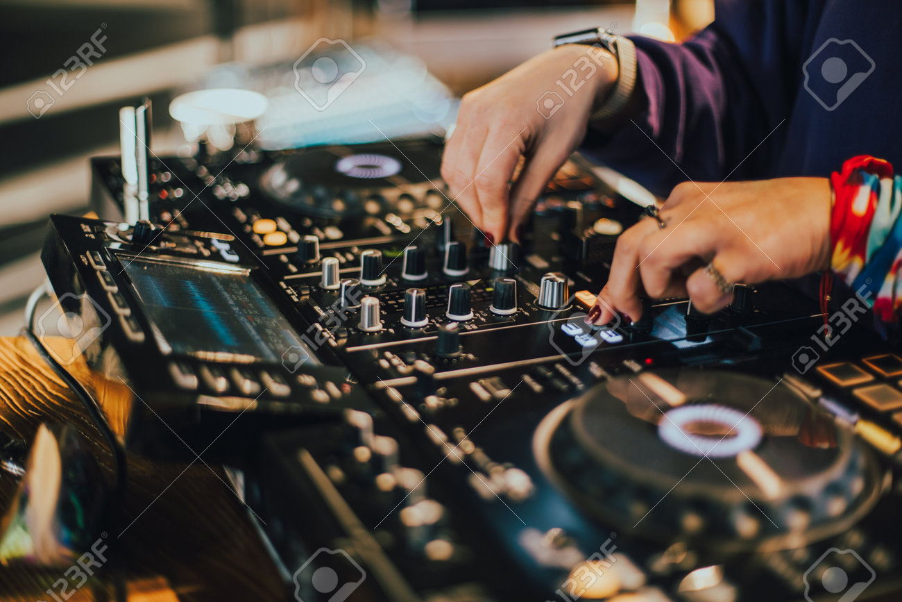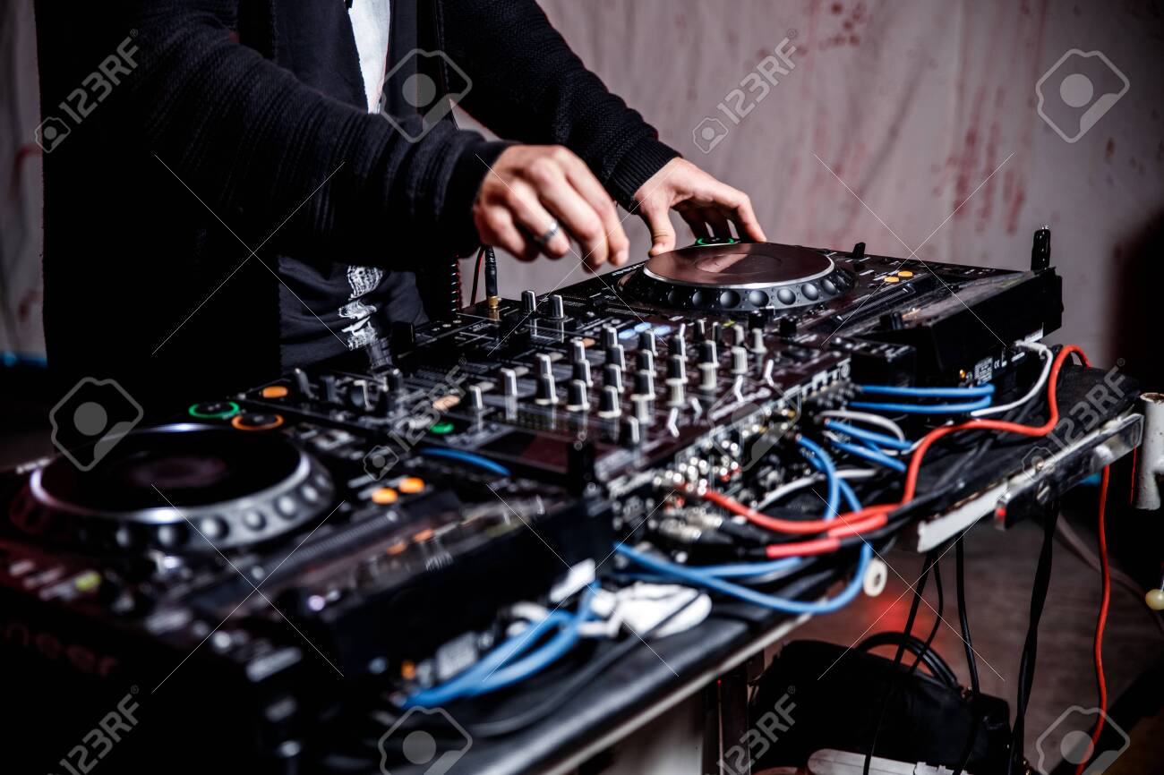 Dj Toca En Vivo Y Mezcla Música En La Consola Giratoria En El ...