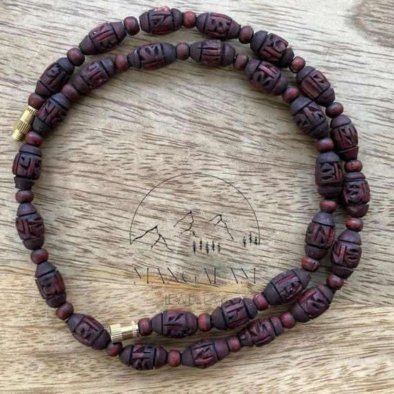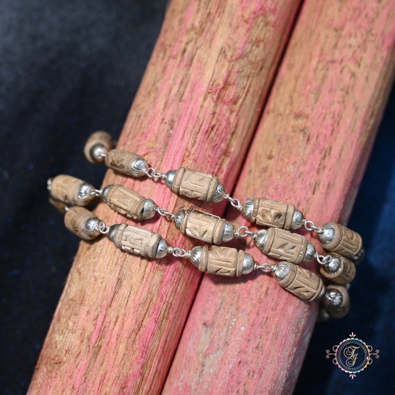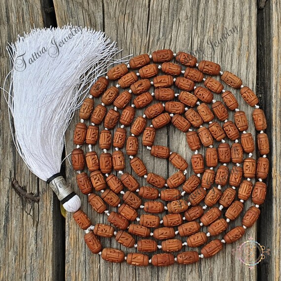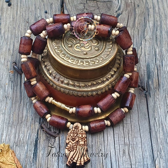 Radha grabado Tulsi Mala marrón oscuro para rejuvenecimiento, Mala de cuentas de madera de albahaca, collar de Tulasi, cuentas de oración India Mala hindú - Etsy España