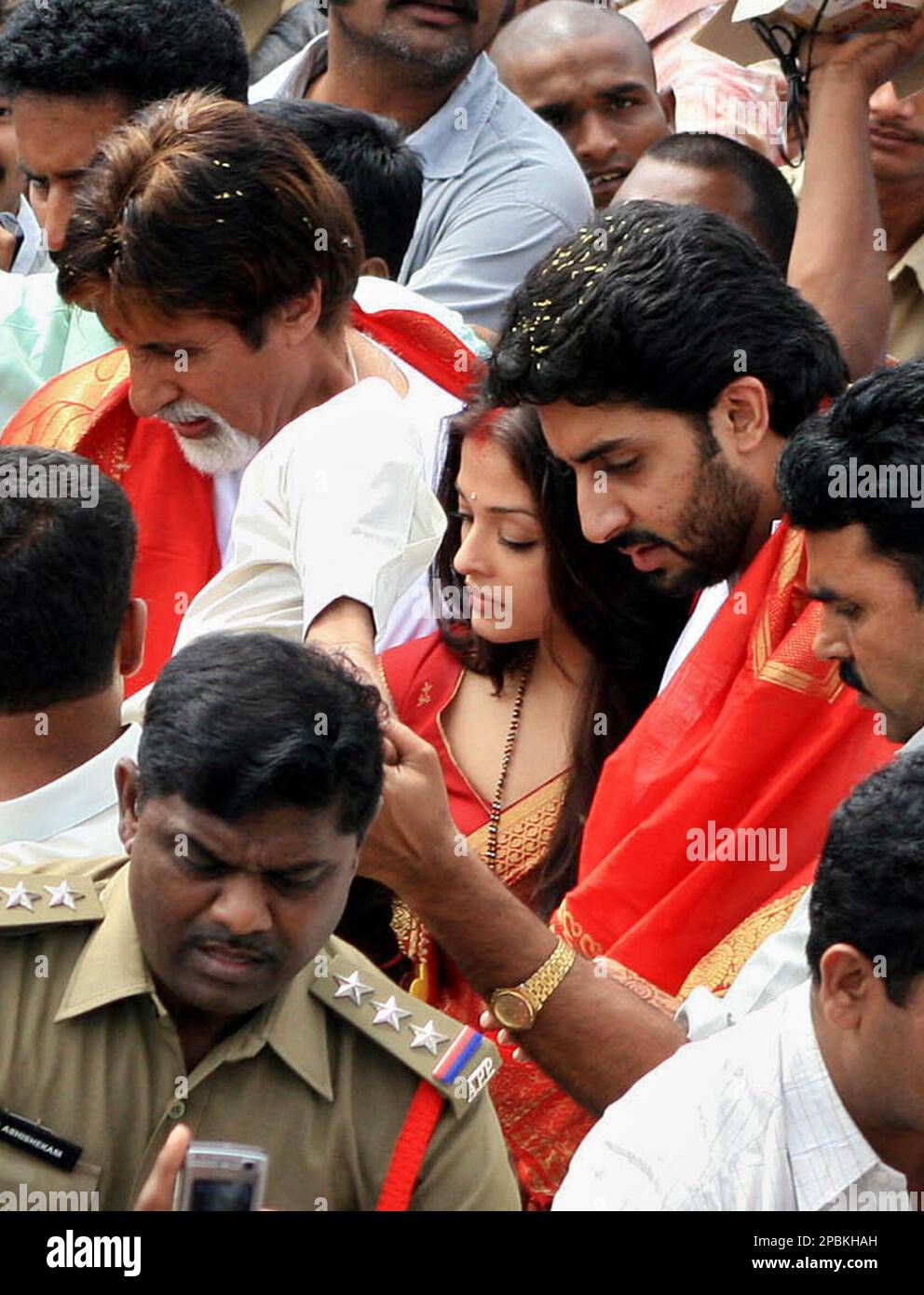 Newlywed Bollywood couple Abhishek Bachchan, center right, and Aishwarya Rai, center, come out after offering prayers at the Tirupati temple, 156 kilometers (98 miles) northwest of Chennai, India, Sunday, April 22, 2007.