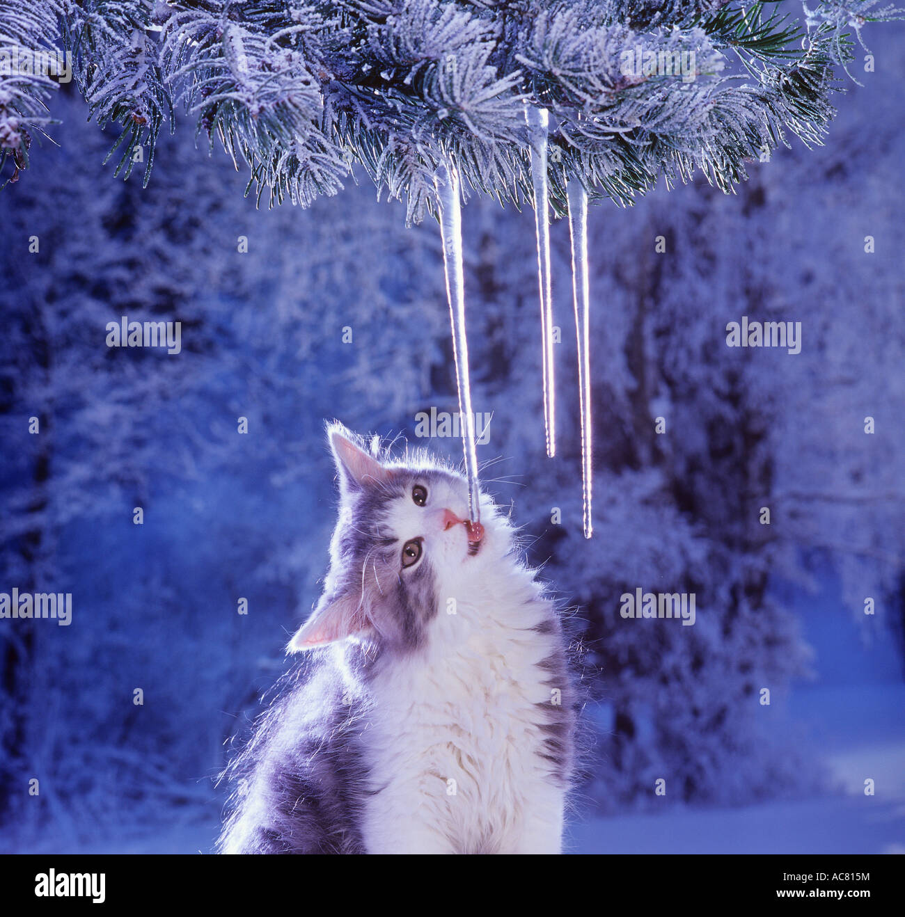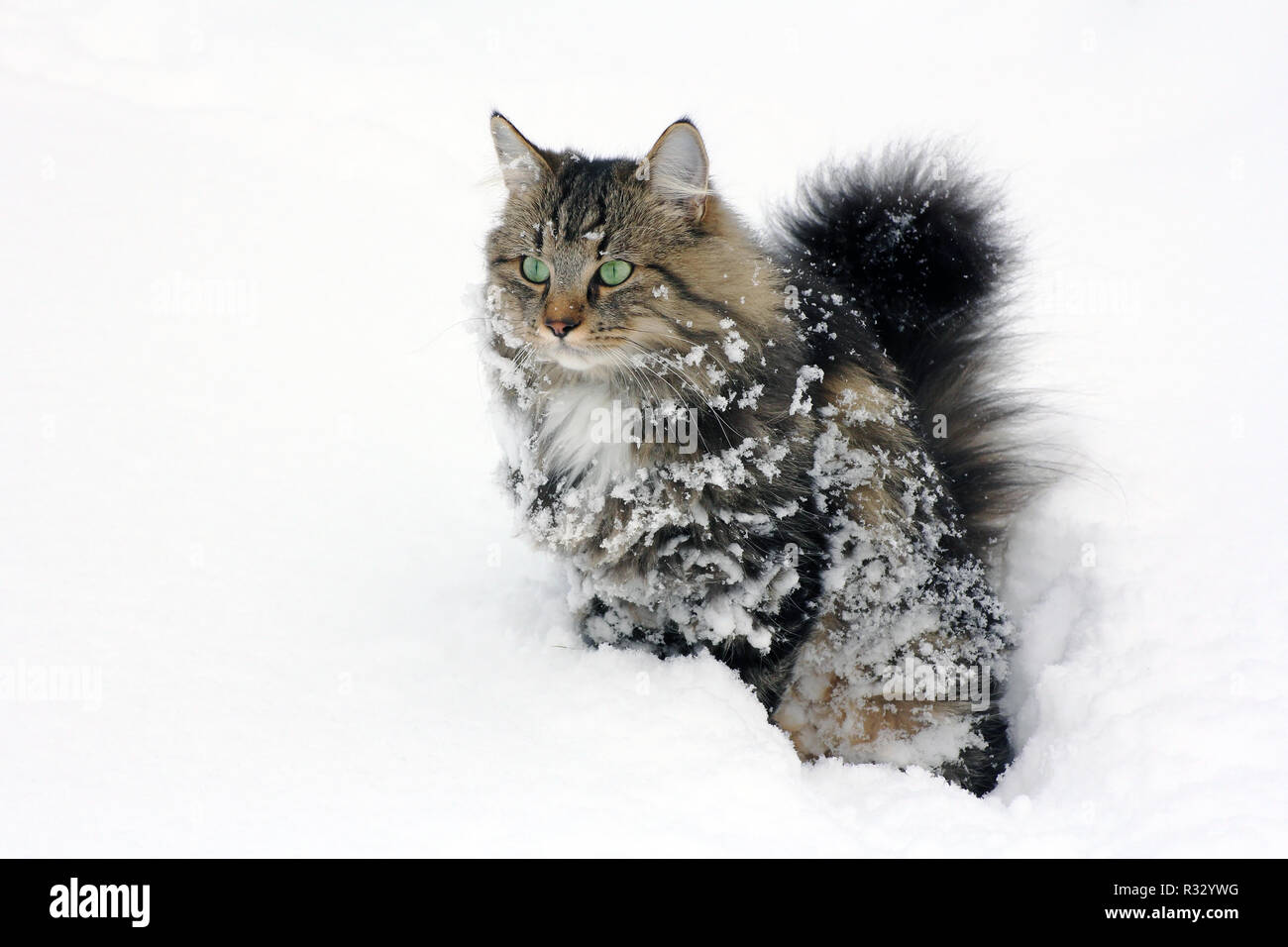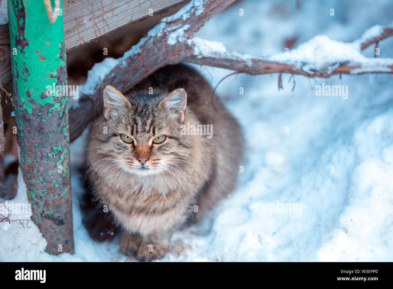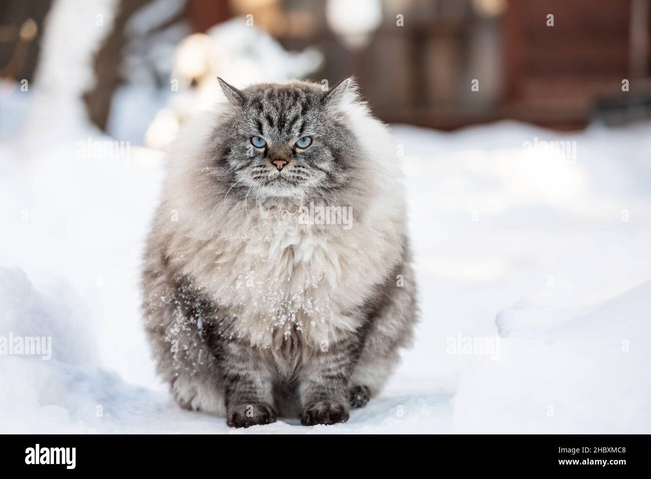 Siberian gato sentado afuera en la nieve en invierno Fotografía de stock - Alamy