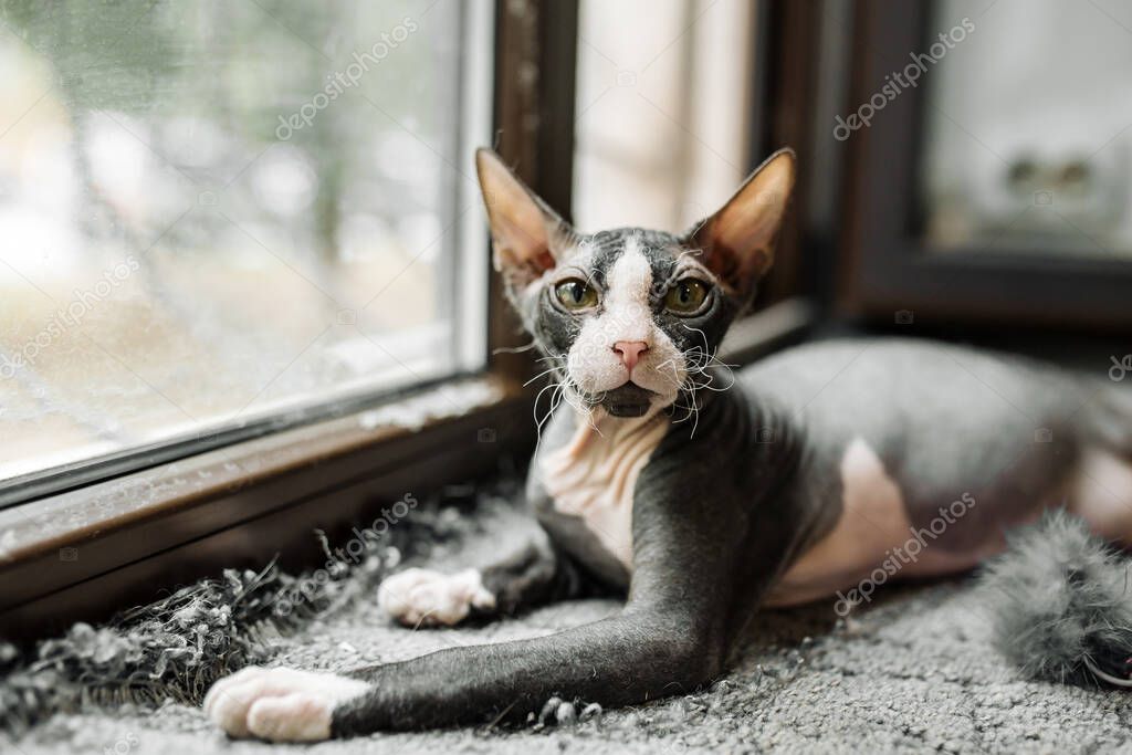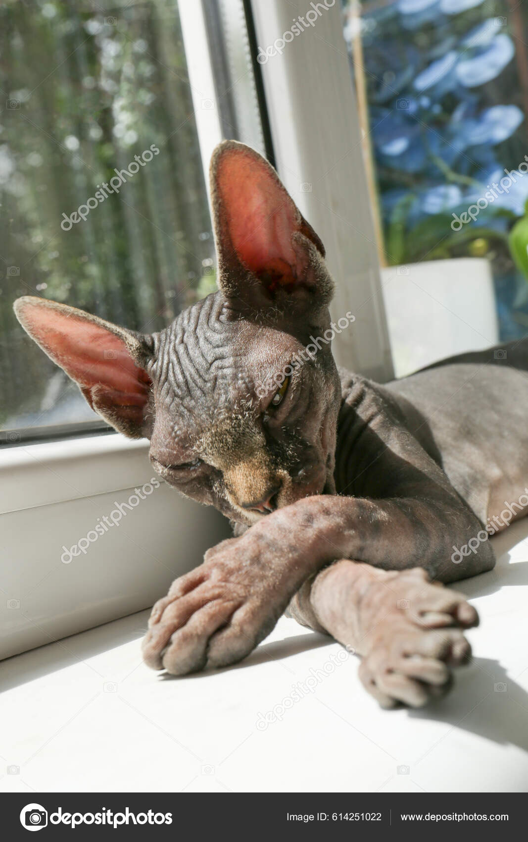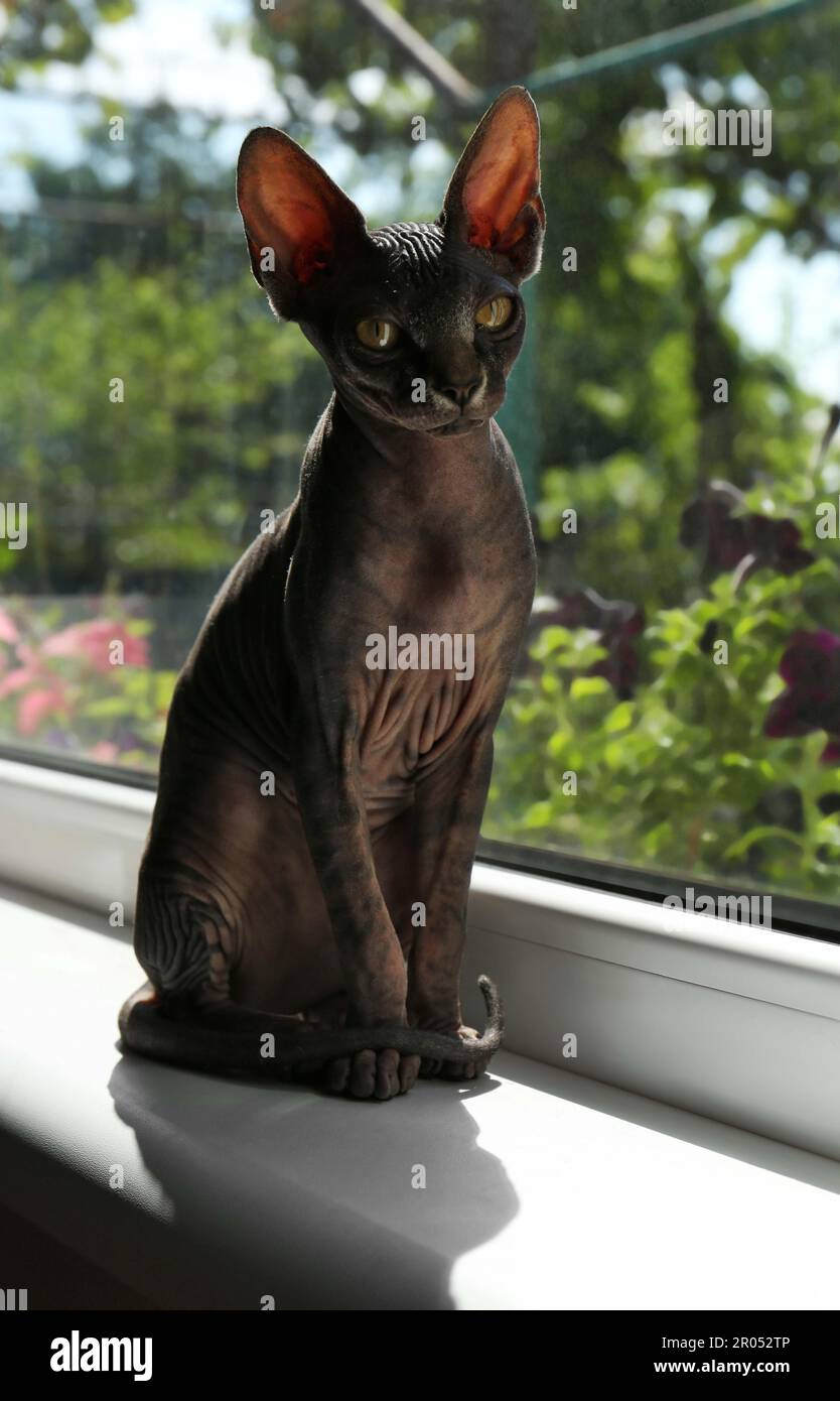 Adorable gato esfinge negro acostado en la repisa de la ventana en el interior, primer plano Fotografía de stock - Alamy