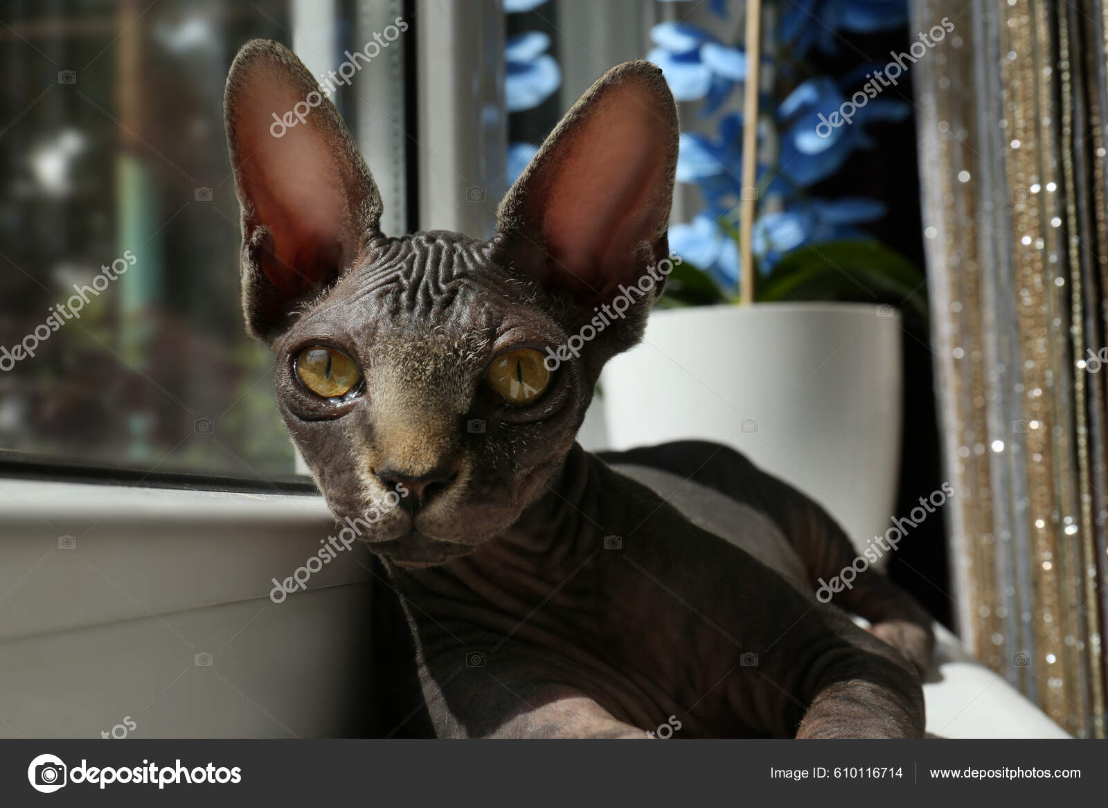 Domestic Black Cat Sphinx with Short Hair Sitting in the Apartment Turned Stock Photo - Image of breed, looks: 137456388