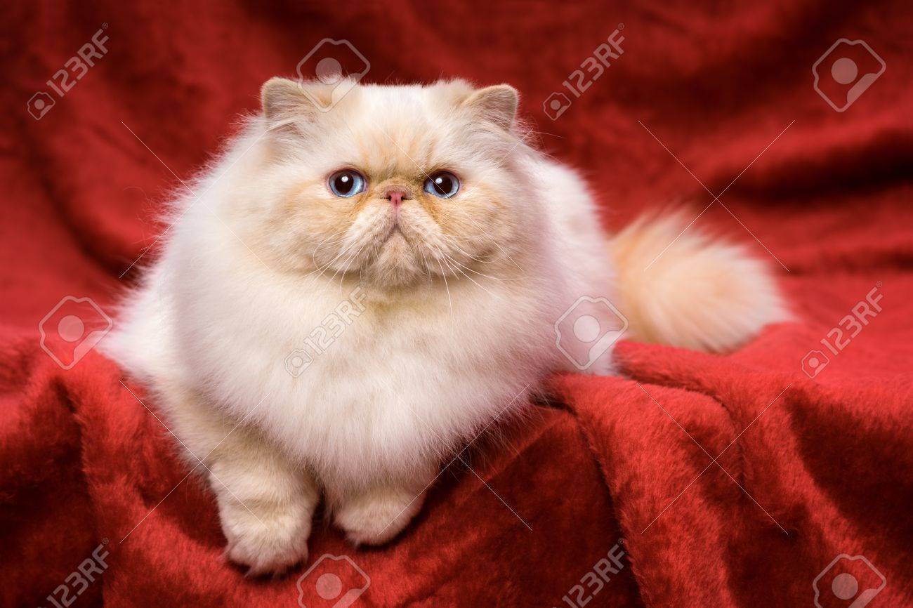 Hermoso Gato Persa Crema Colorpoint Poco Con Ojos Azules Está Mintiendo Frontal Contra Un Fondo De Terciopelo Rojo Fotos, retratos, imágenes y fotografía de archivo libres de derecho. Image 38284052