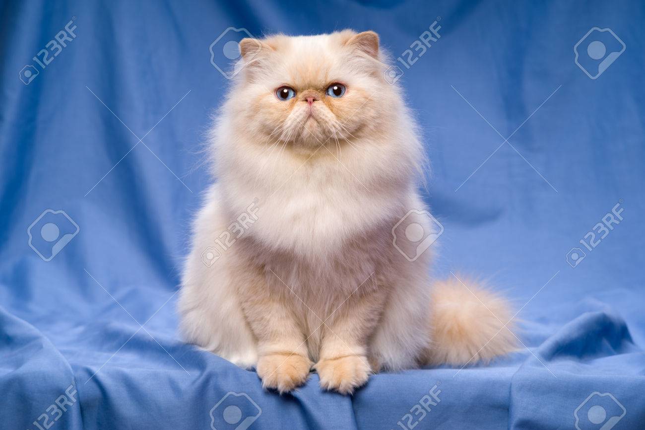 Beautiful Persian Cream Colorpoint Cat Whith Blue Eyes Is Lying Frontal On A Blue Textile Background Stock Photo, Picture and Royalty Free Image. Image 38284051.