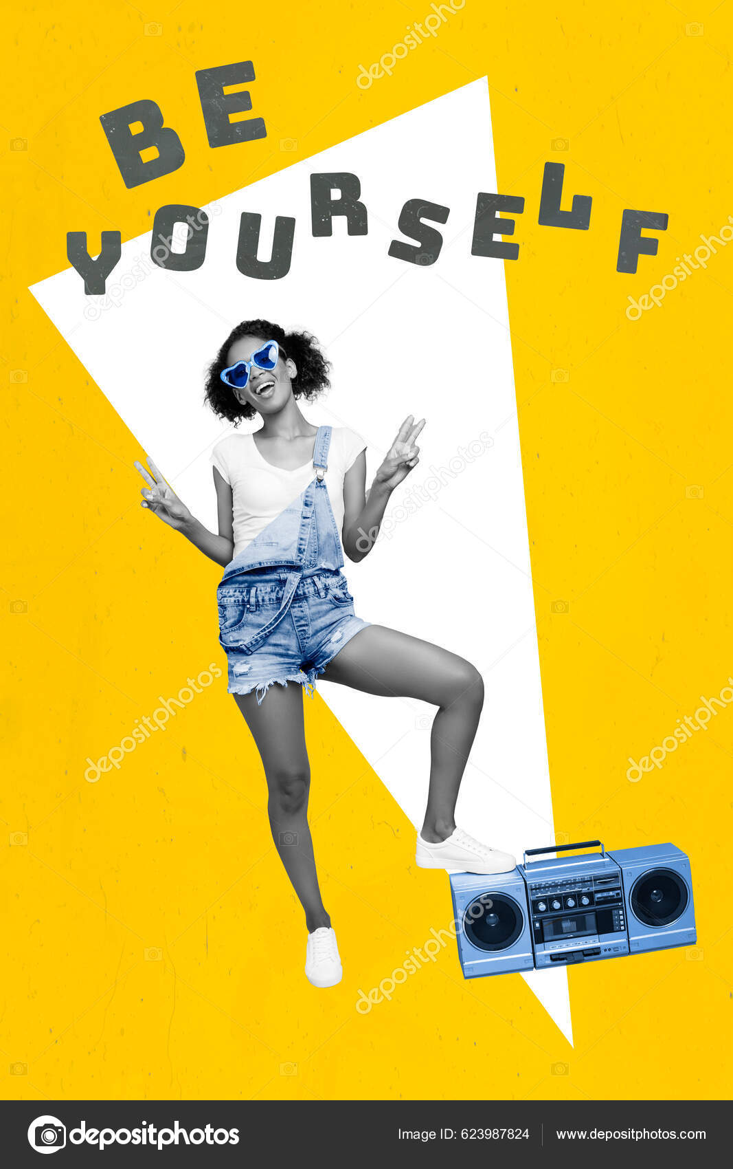 Imagen Collage Vertical Excitado Positivo Chica Bonita Mantenga Boombox Mostrar: fotografía de stock © deagreez1 #647324128 | Depositphotos