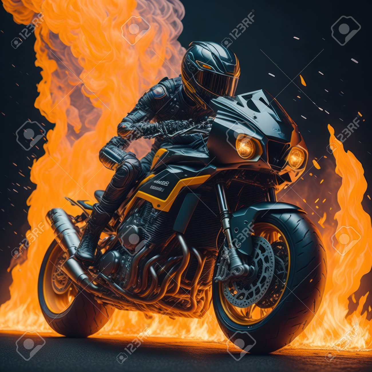 Jinete Conduciendo Una Moto Grande Y Genial Contra El Telón De Fondo Del Fuego. Ai Generativa Fotos, retratos, imágenes y fotografía de archivo libres de derecho. Image 208039990