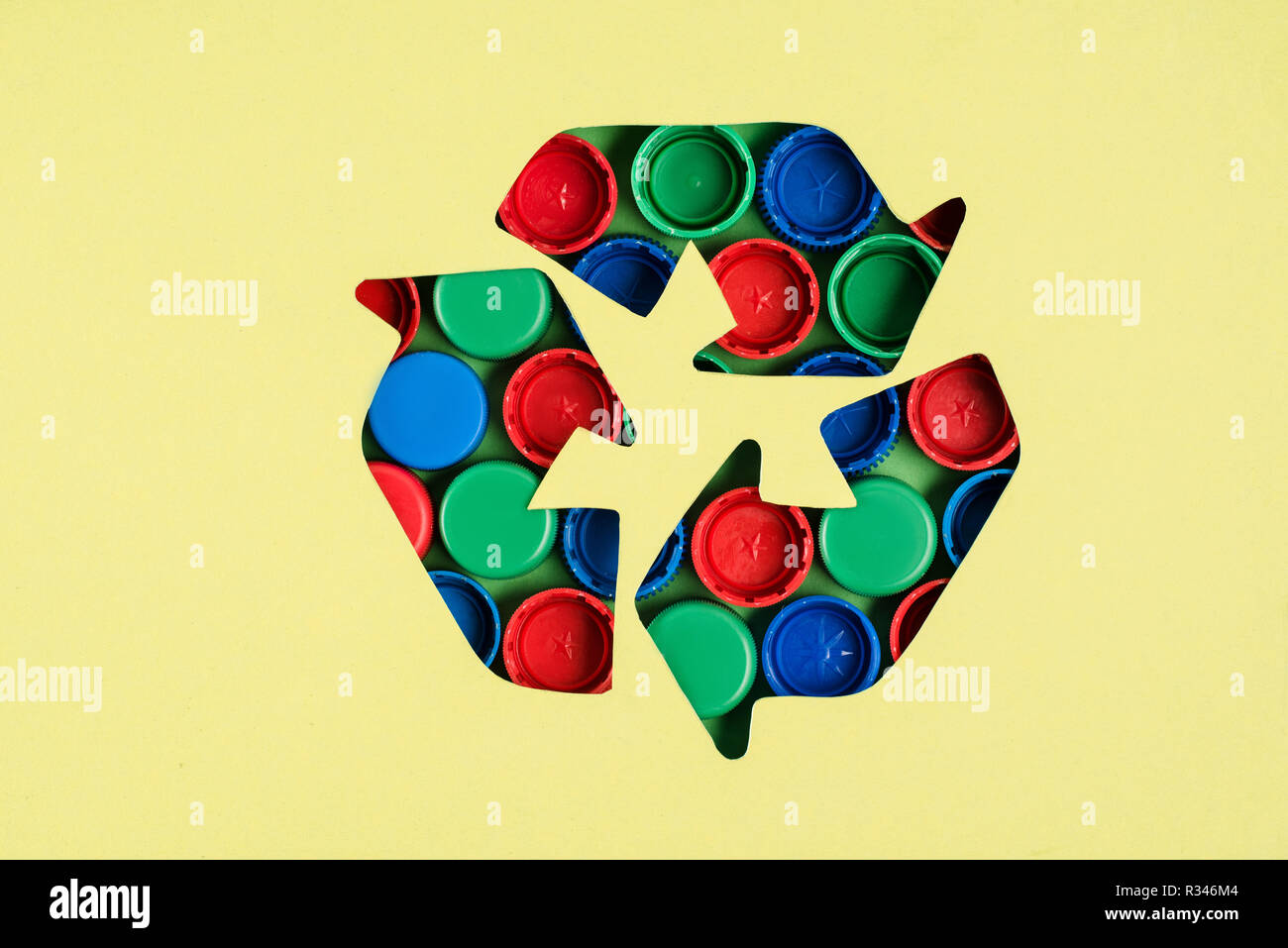 Vista superior de reciclar cartel con tapas de botella patrón sobre fondo amarillo Fotografía de stock - Alamy