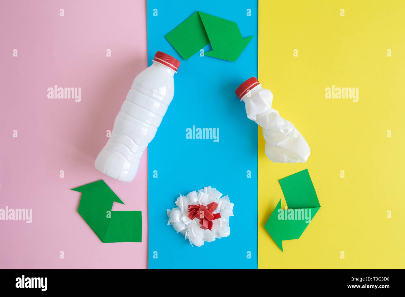 Reciclar cartel con botellas de plástico aislado sobre fondo pastel creativo mínimo concepto eco Fotografía de stock - Alamy