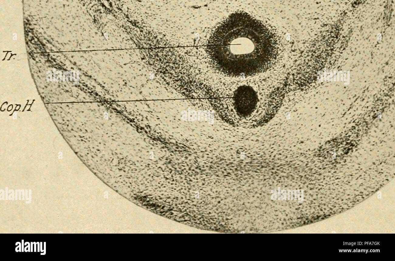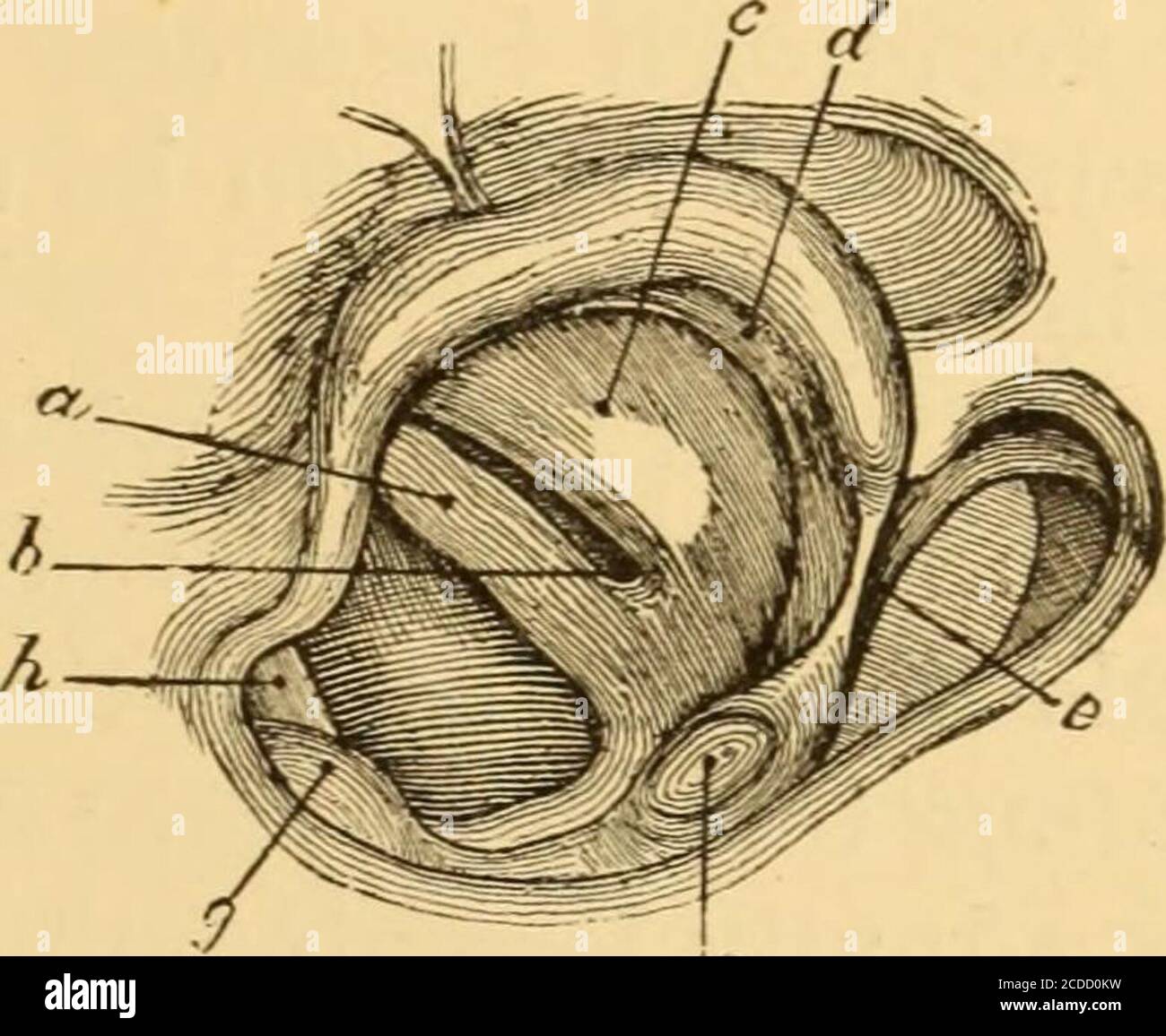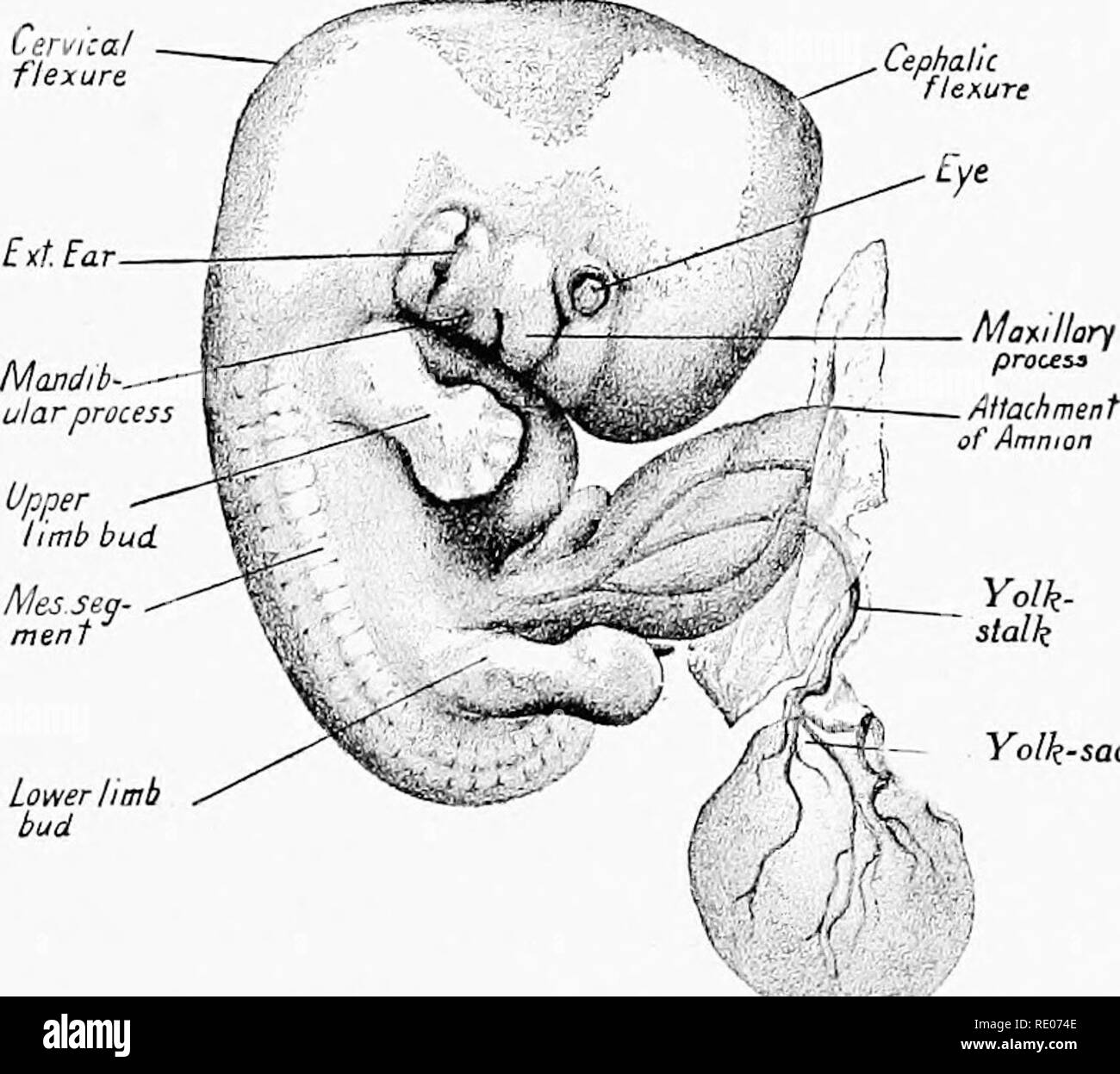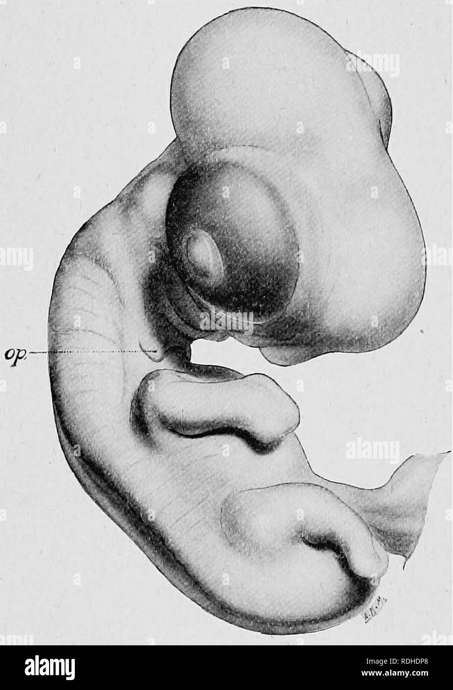 Un manual de laboratorio y libro de texto de embriología. Embriología. Fig. 150.-Vista lateral de la cabeza de un embrión de 7 mm. de cerdo. Las tres líneas indican los planos