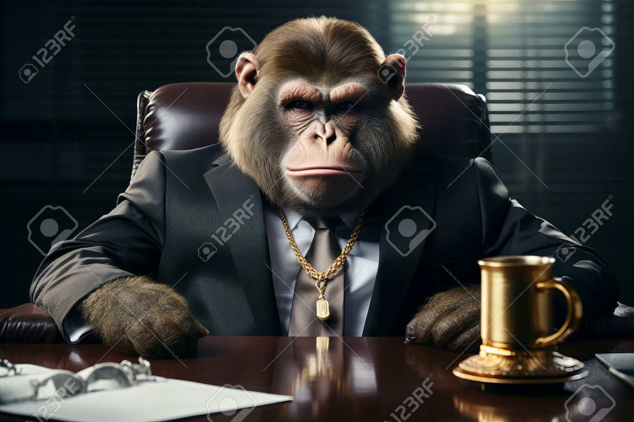 Un Gorila Grande Y Gordo Vestido Con Ropa Humana, Pesadas Cadenas Doradas Y Monedas, Sentado En La Mesa De La Oficina, Luciendo Serio Y Confiado, Listo Para Hacer Negocios Con Tecnología De